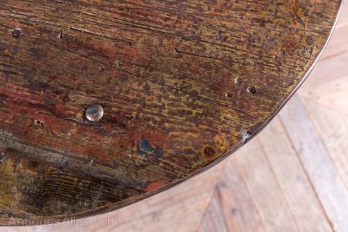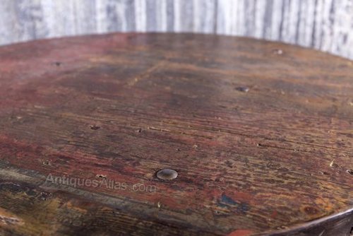 The table base has an authentic worn orange paintwork, and the timber top has an aged and distressed appearance, which adds character and charm to this unusual piece of furniture.