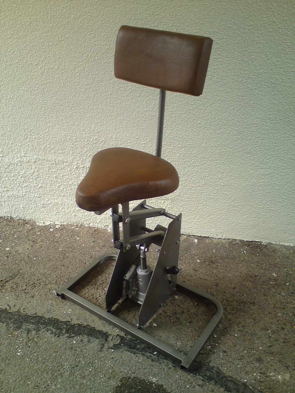 it has an unusual cantilever height adjustment based on a foot operated pedal. There is also a lever to let the seat down