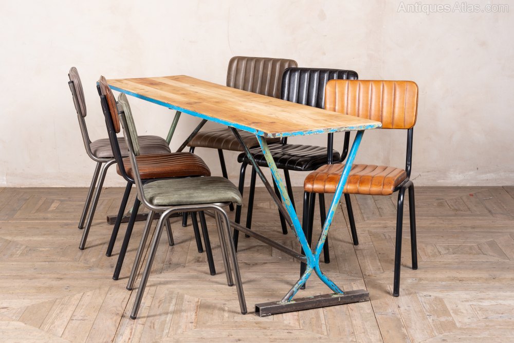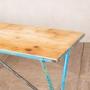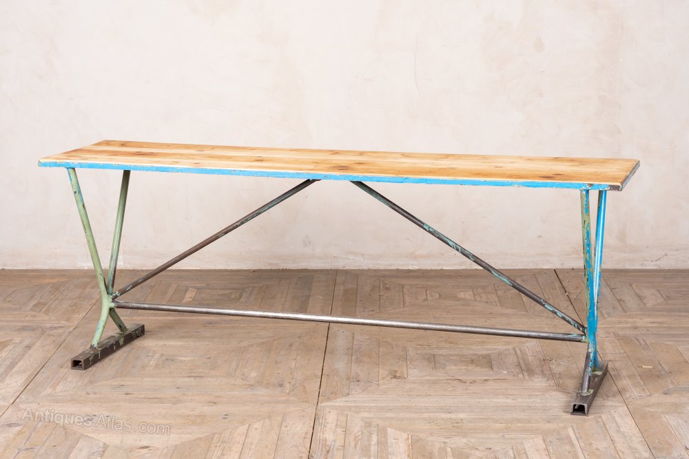 The metal base table boasts distinctive original paintwork, which has a unique distressed finish. The pine top can be used as a prep table, for those who need that extra workspace in their kitchen.