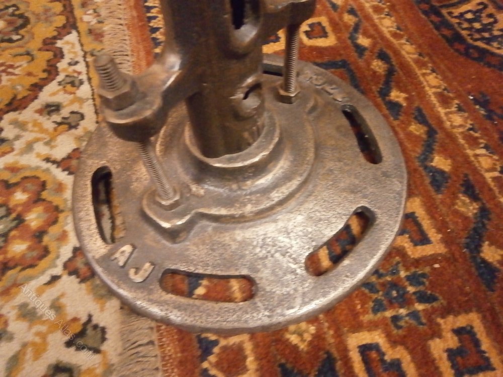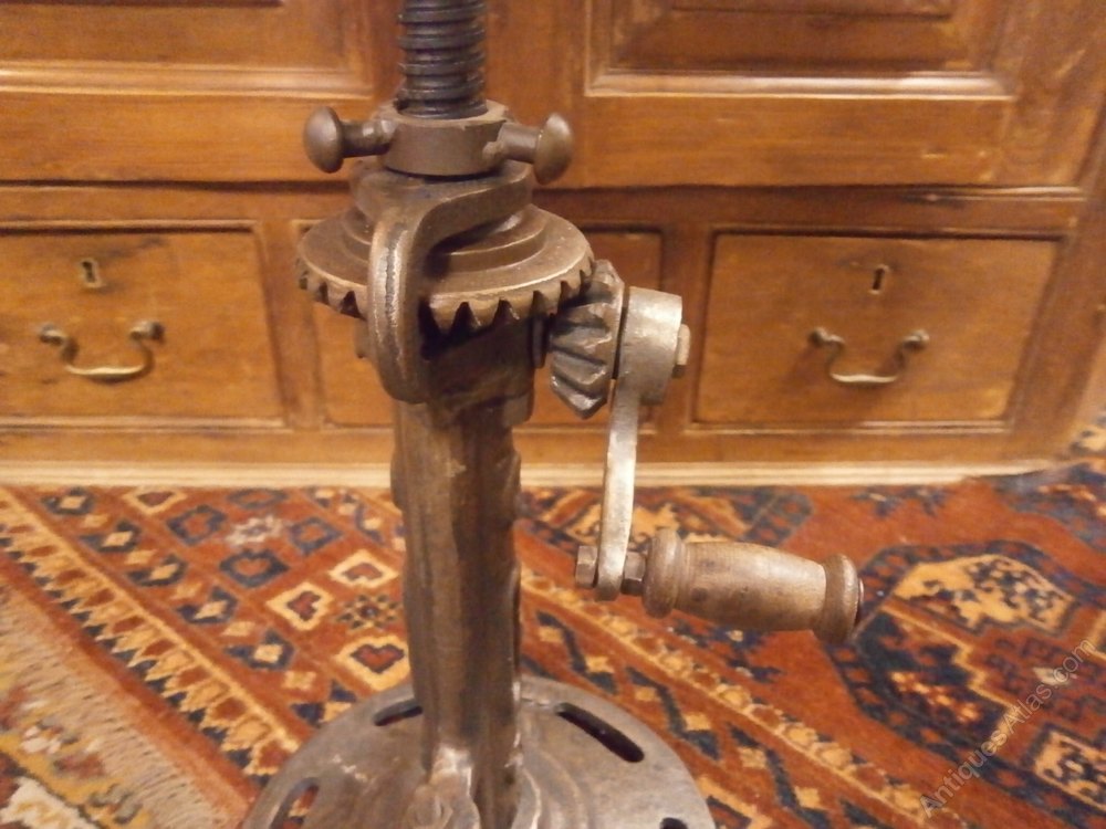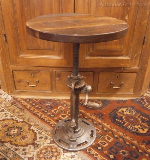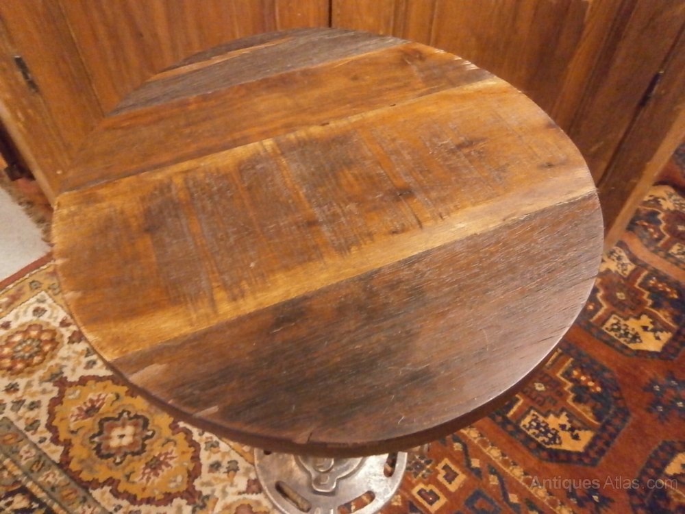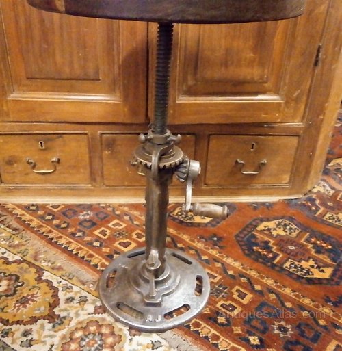 There appears to be a new hardwood top for this stool. The base is cast iron and the winder handle is wooden.
