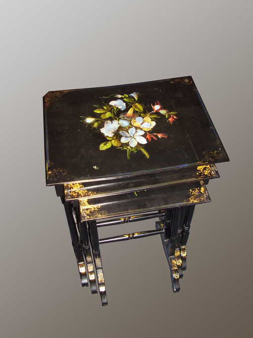 Attractive ebonised inlaid with mother of pearl, gilded and painted Victorian nest of antique tables. Each top heavily inlaid with mother of pearl and very nicely done. Slight damage to the back left corner of the top/biggest table.