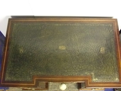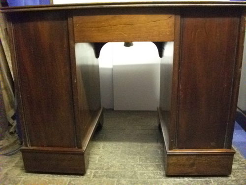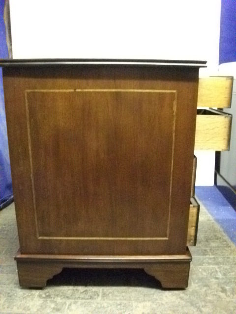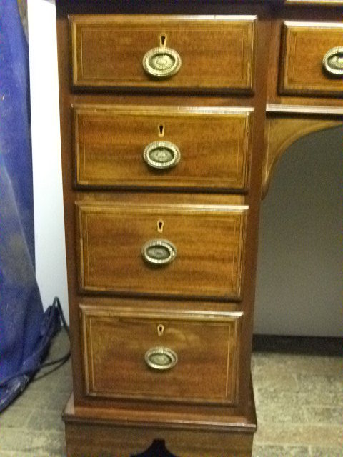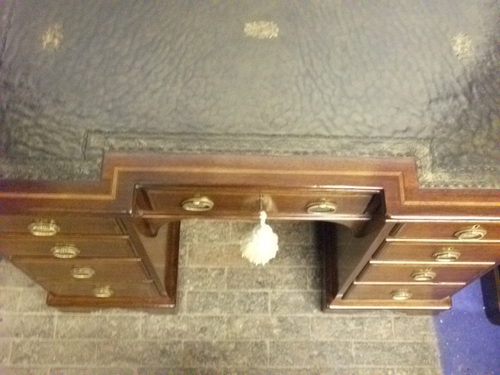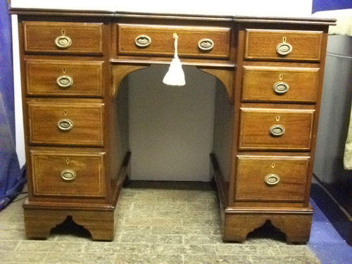 Excellent quality mahogany breakfront 9 drawer desk inlaid with satinwood banding, oak lined drawers, original locks and handles.