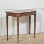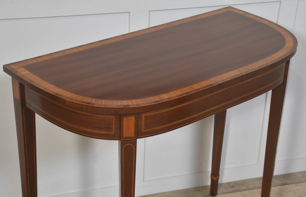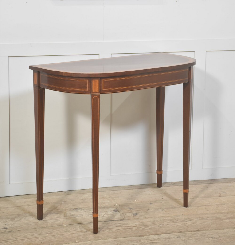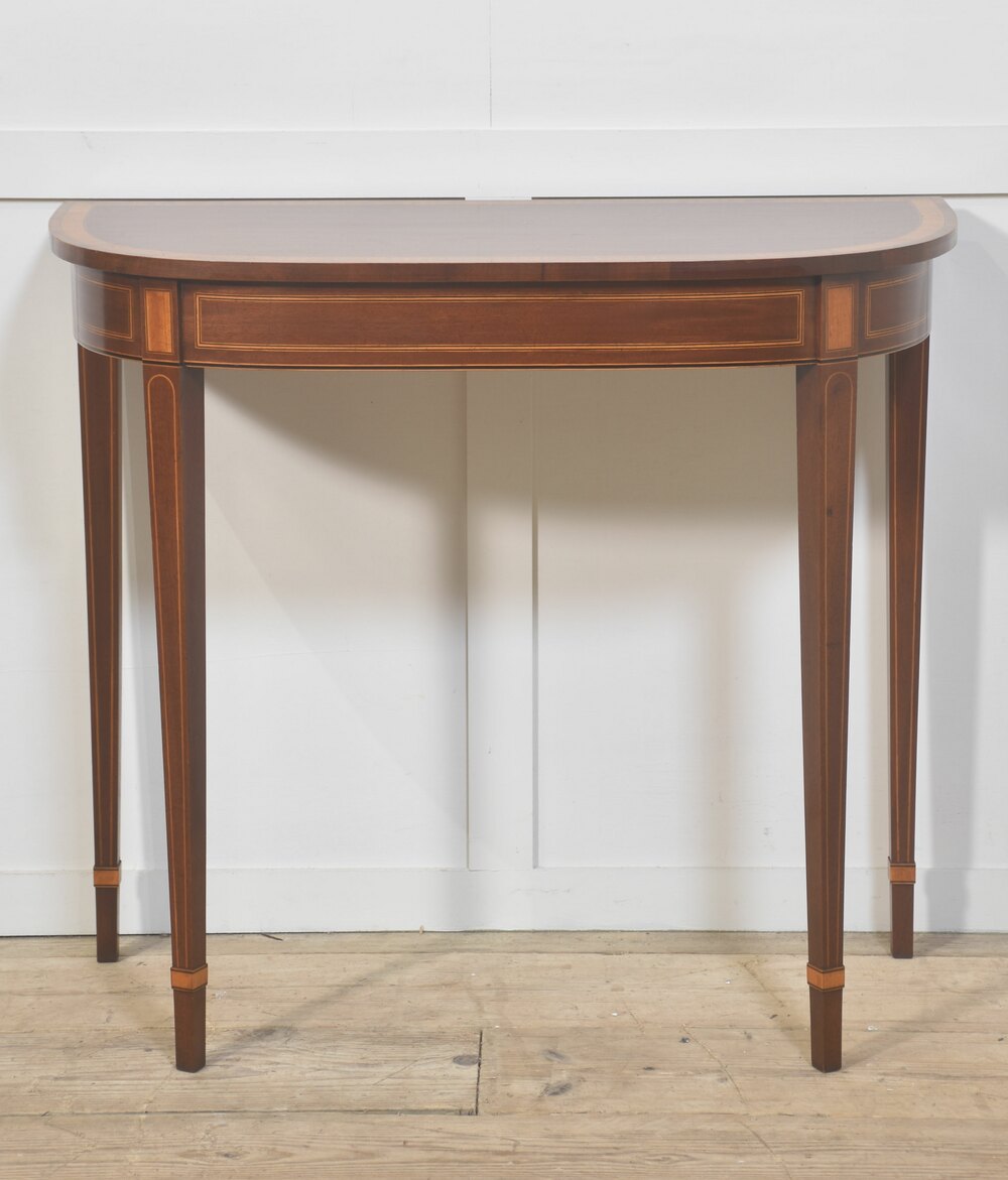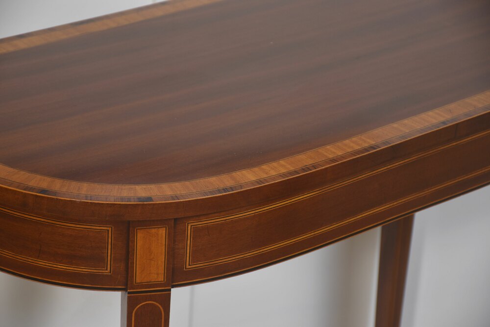 An elegant demi-lune console table, finely crafted in richly figured mahogany and embellished throughout with refined boxwood and satinwood line inlay. The shaped top follows a soft serpentine outline and is bordered by crossbanding, framing a darker central field that enhances the natural depth of the timber. The frieze is gracefully curved and articulated with rectangular inlaid panels, echoing classical architectural motifs.