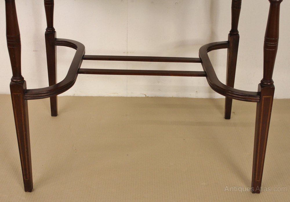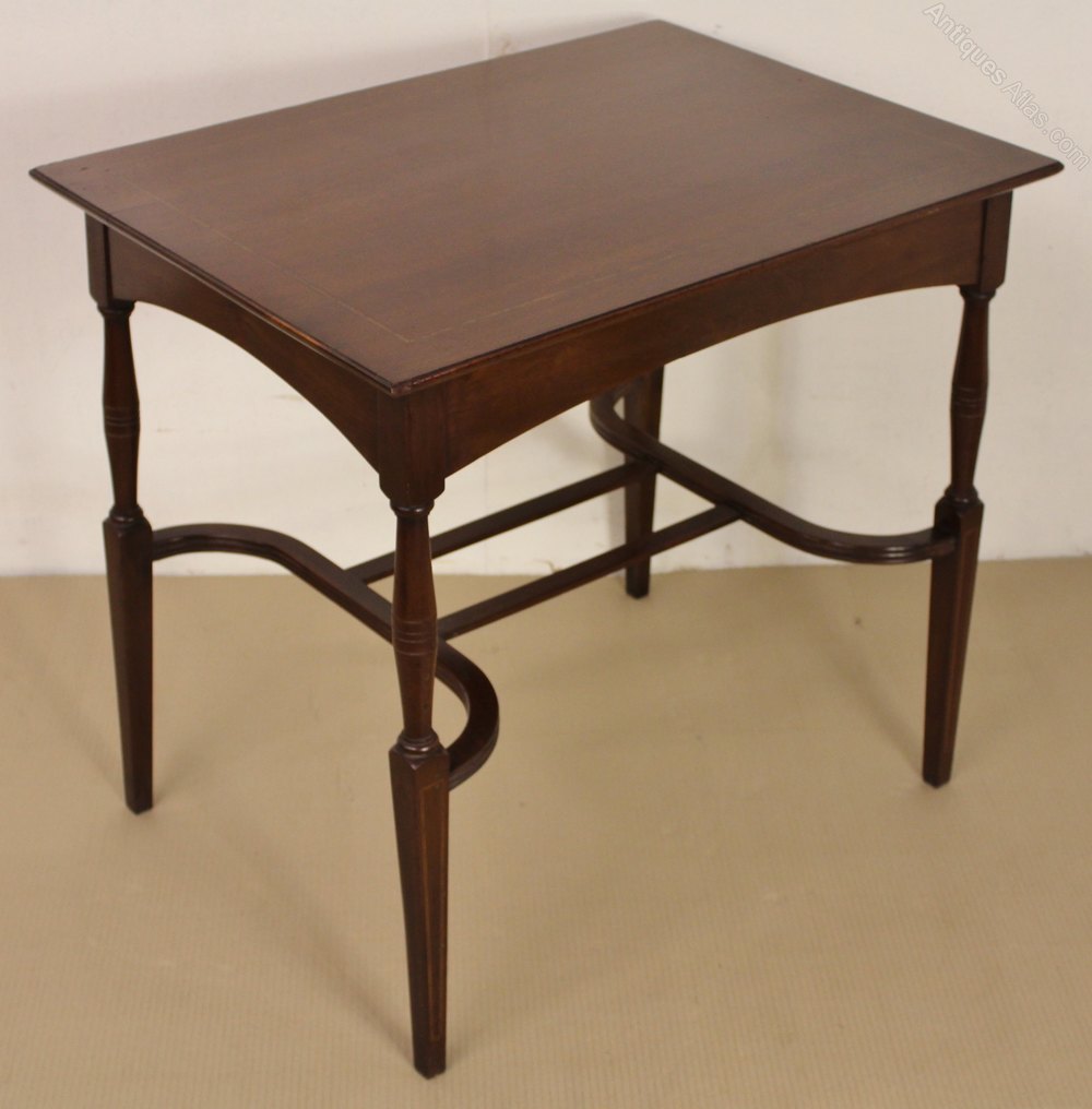 A nice Edwardian occasional table. Well made in solid mahogany with inlaid detailing to the rectangular top and also the legs. The elegant legs are united by interesting shaped under-stretchers , a real design feature. This practical and desirable table is offered for sale in excellent condition, ready to go straight into the home.