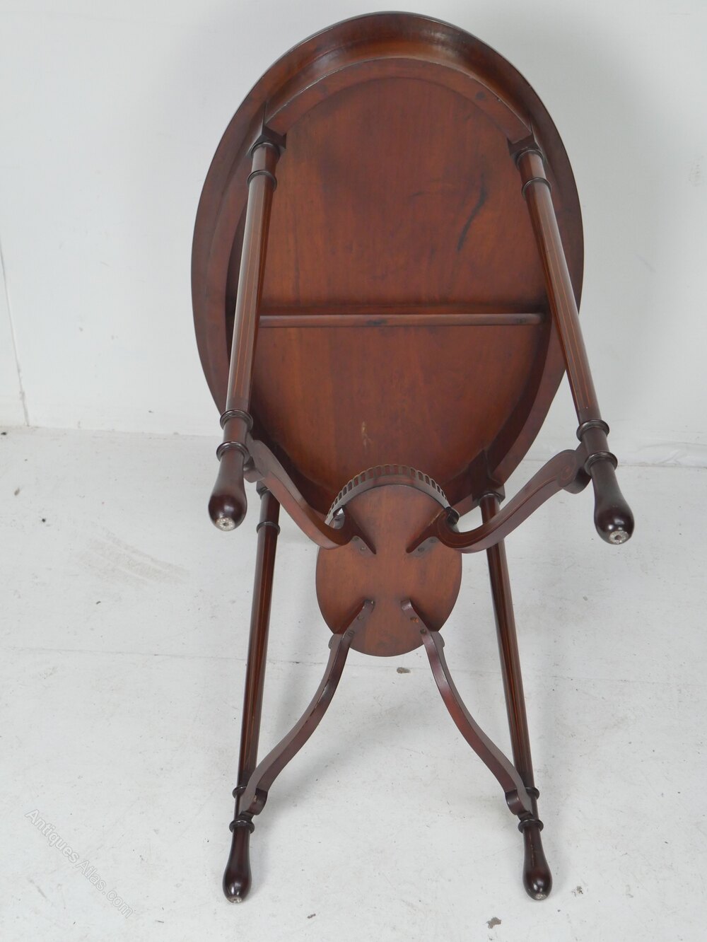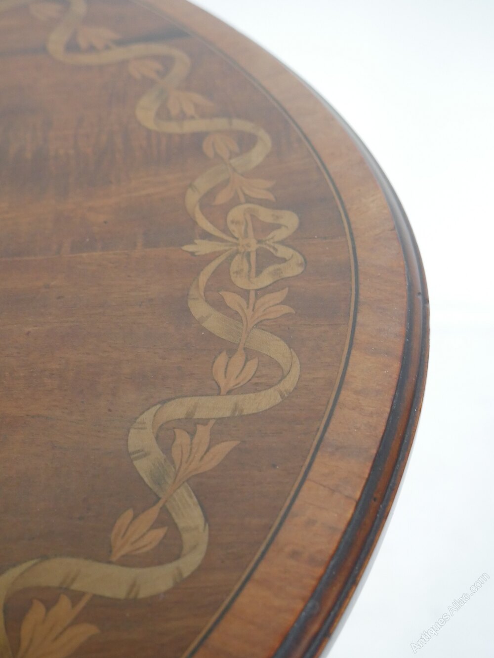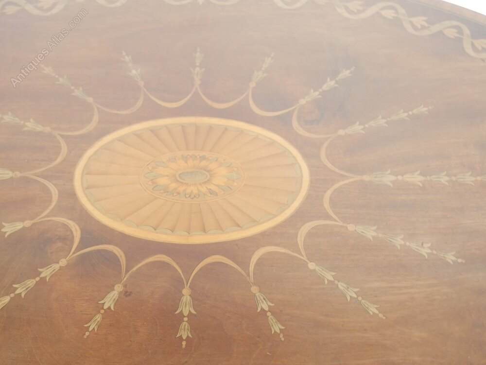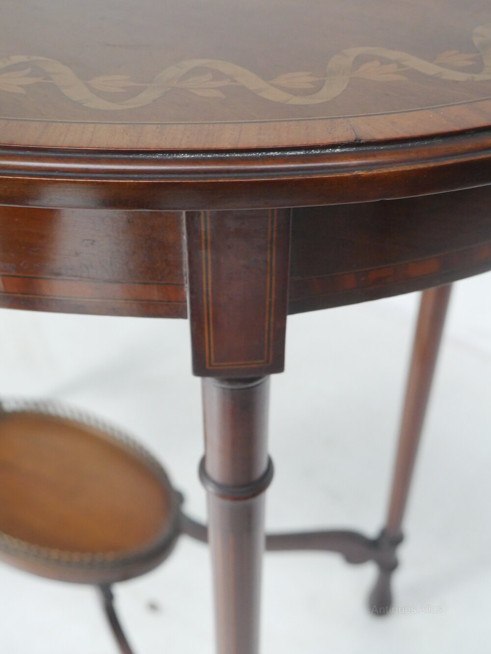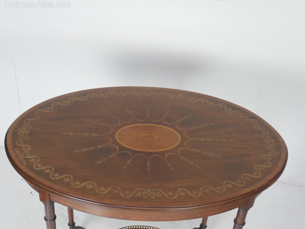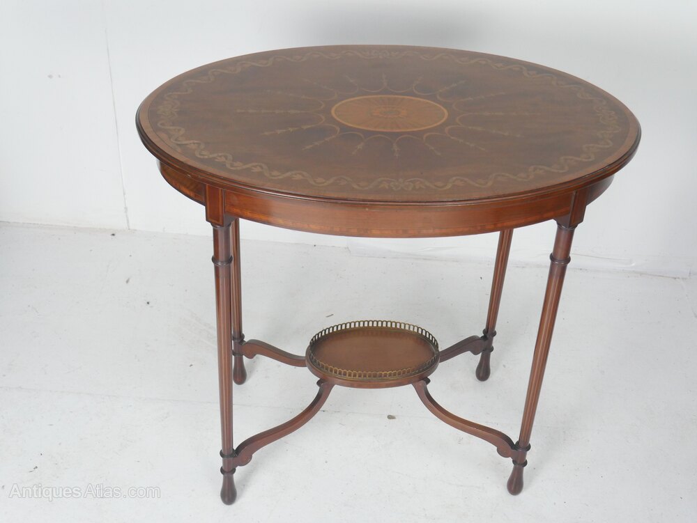 A very pretty inlaid mahogany lamp or occasional table, with a oval inlaid decorated top, turned legs with a neat oval undershelf and shaped supporting stretchers. A very well made table in very good condition, all ready to be enjoyed.