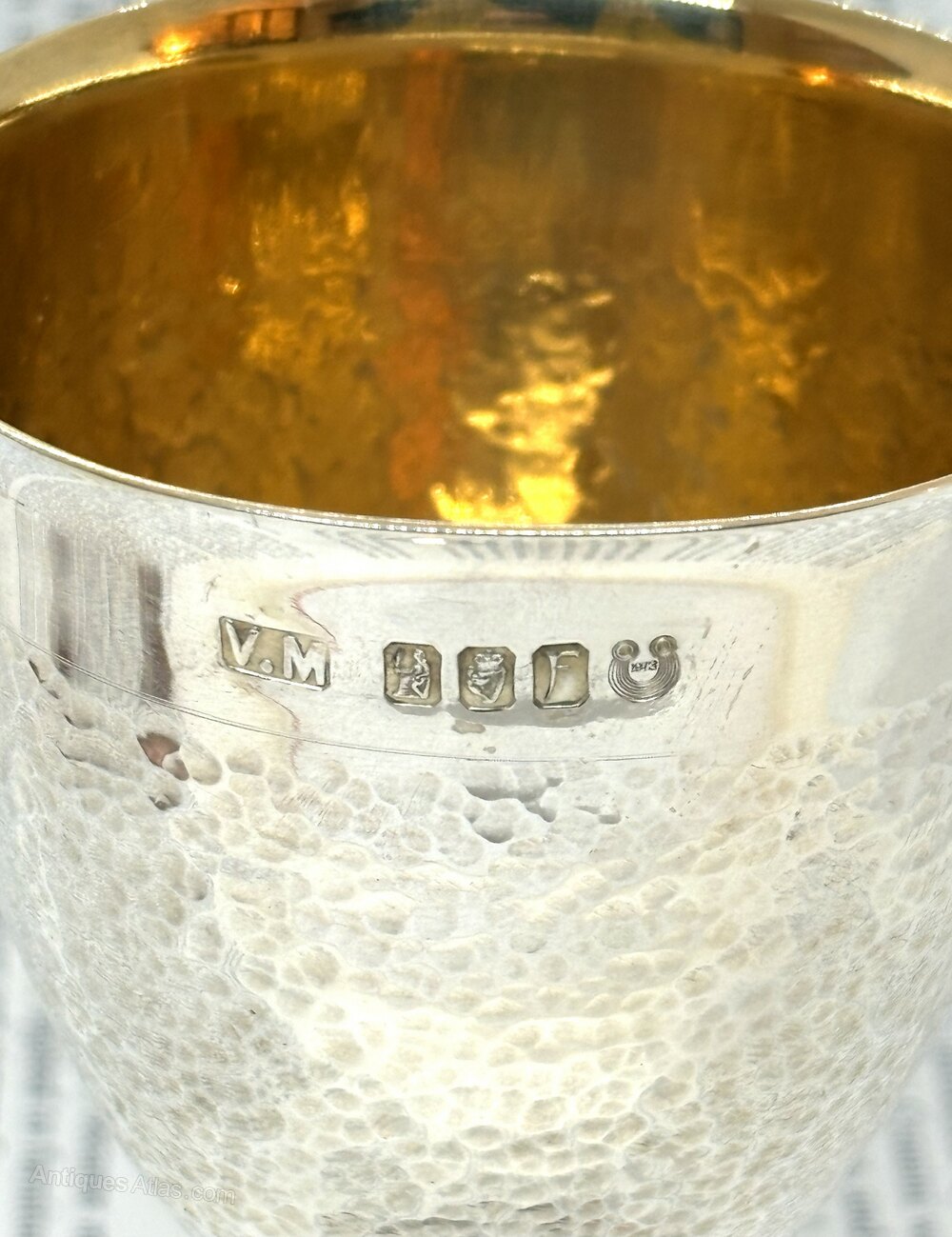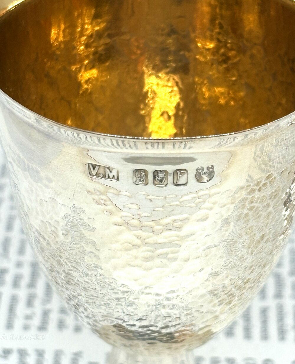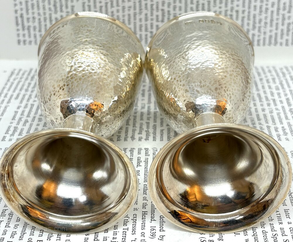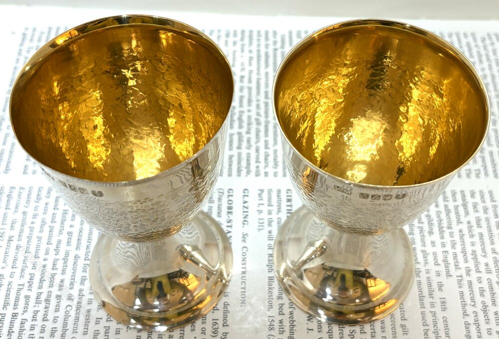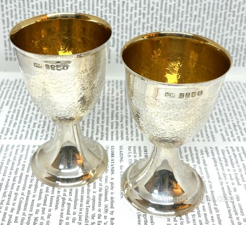 Here we have a fine quality pair of Irish silver chalices with hammered finish and gilt interior, they are fully clearly hallmarked for Dublin 1978 and V.M and are in perfect condition.