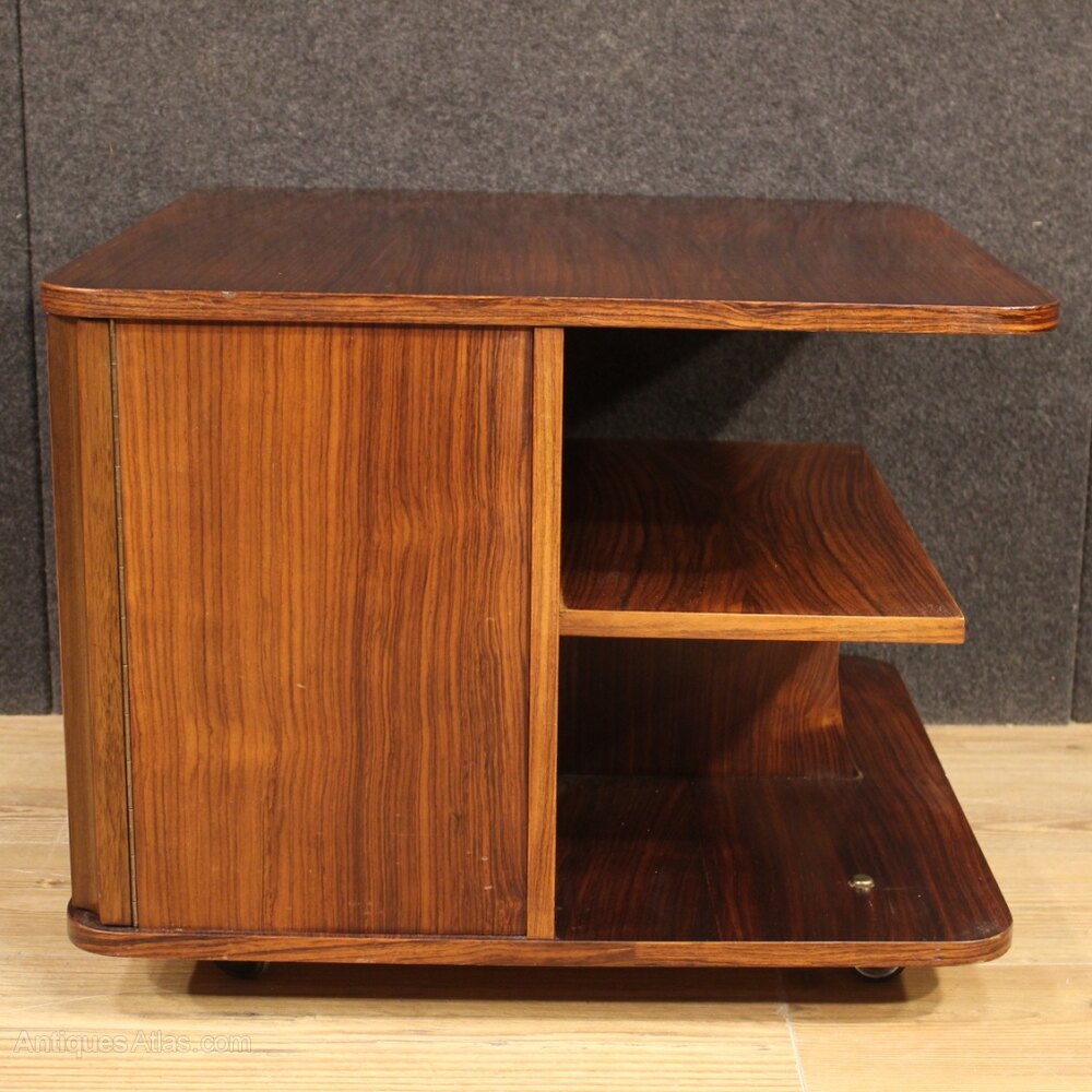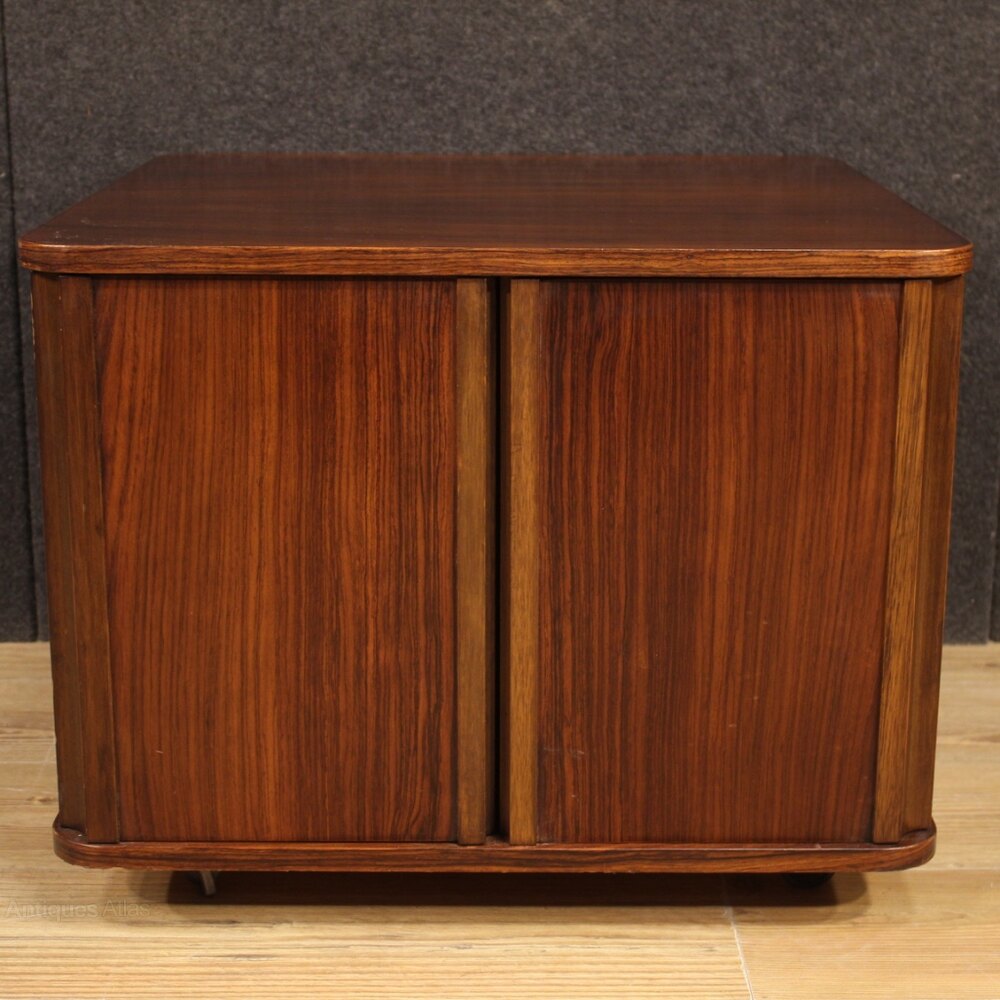 Italian coffee table from the 70s / 80s. Furniture in walnut and palisander woods mounted on swivel castors (see photo). Table of excellent proportion and service equipped with three shelves and two side doors (see photo). Ideal furniture for a living room but it can be easily placed in different points of the house. In good condition with some small signs of aging.