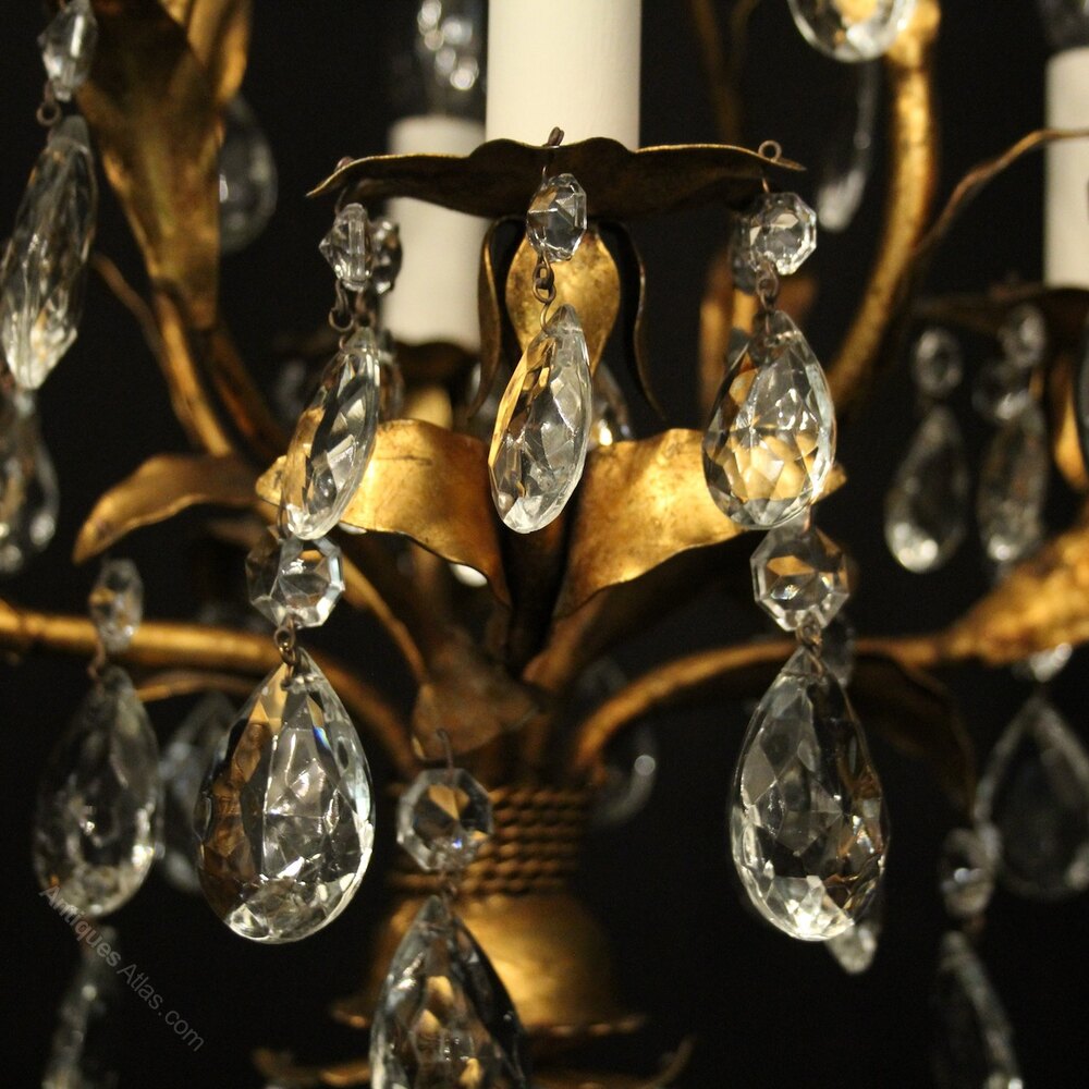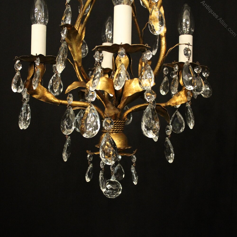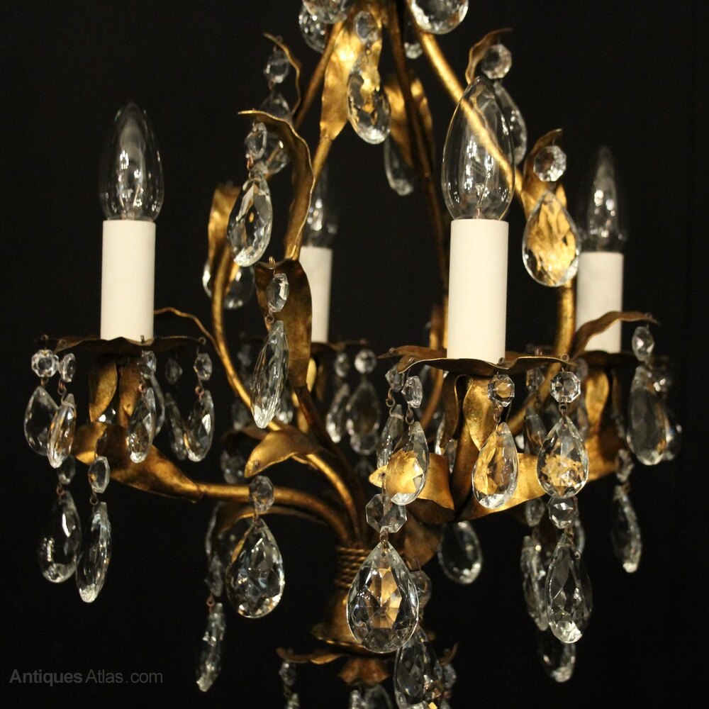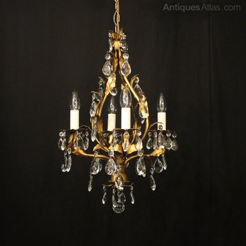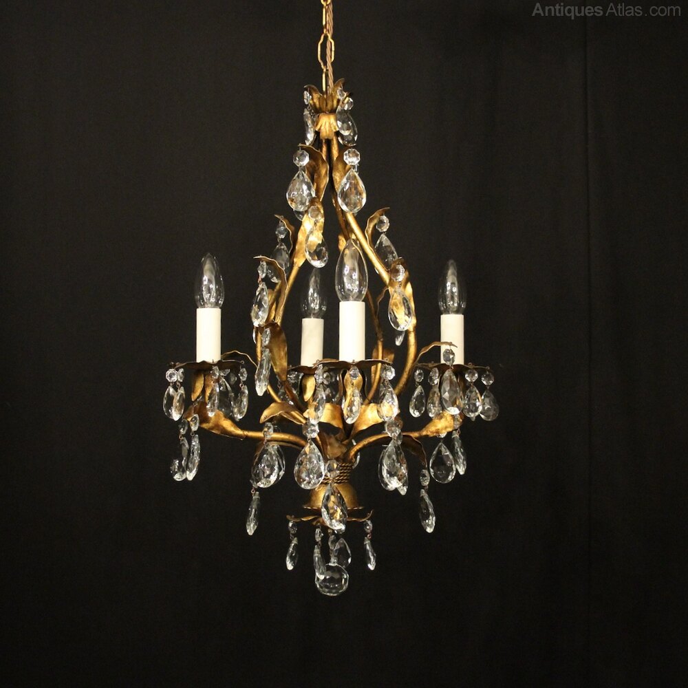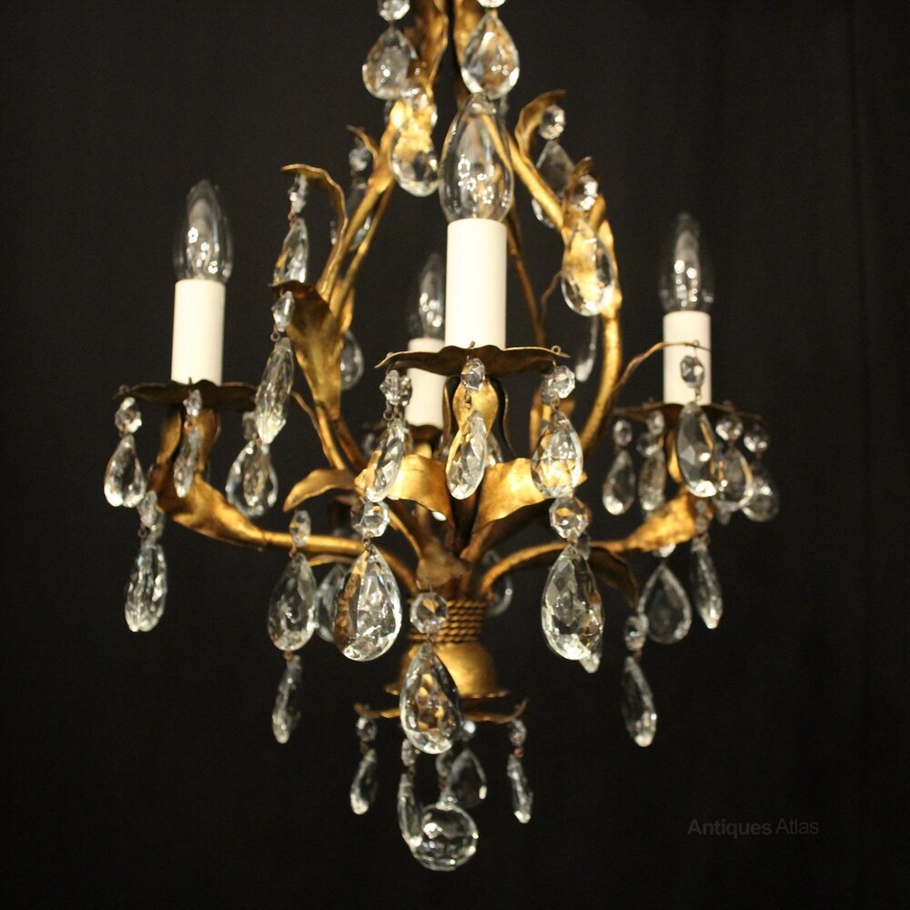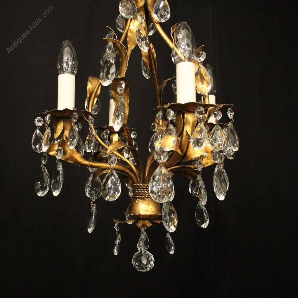 A decorative Italian gilded and molded glass 4 light chandelier, the leaf clad scrolling arms with leaf foliated bobeche drip pans, issuing from an open cage centre, decorated with faceted molded glass pendants and having the original chain and ceiling rose, lovely original patination, very pretty and great form. Fully rewired and PAT tested. All our chandeliers come with ceiling fixings and spare bulbs.