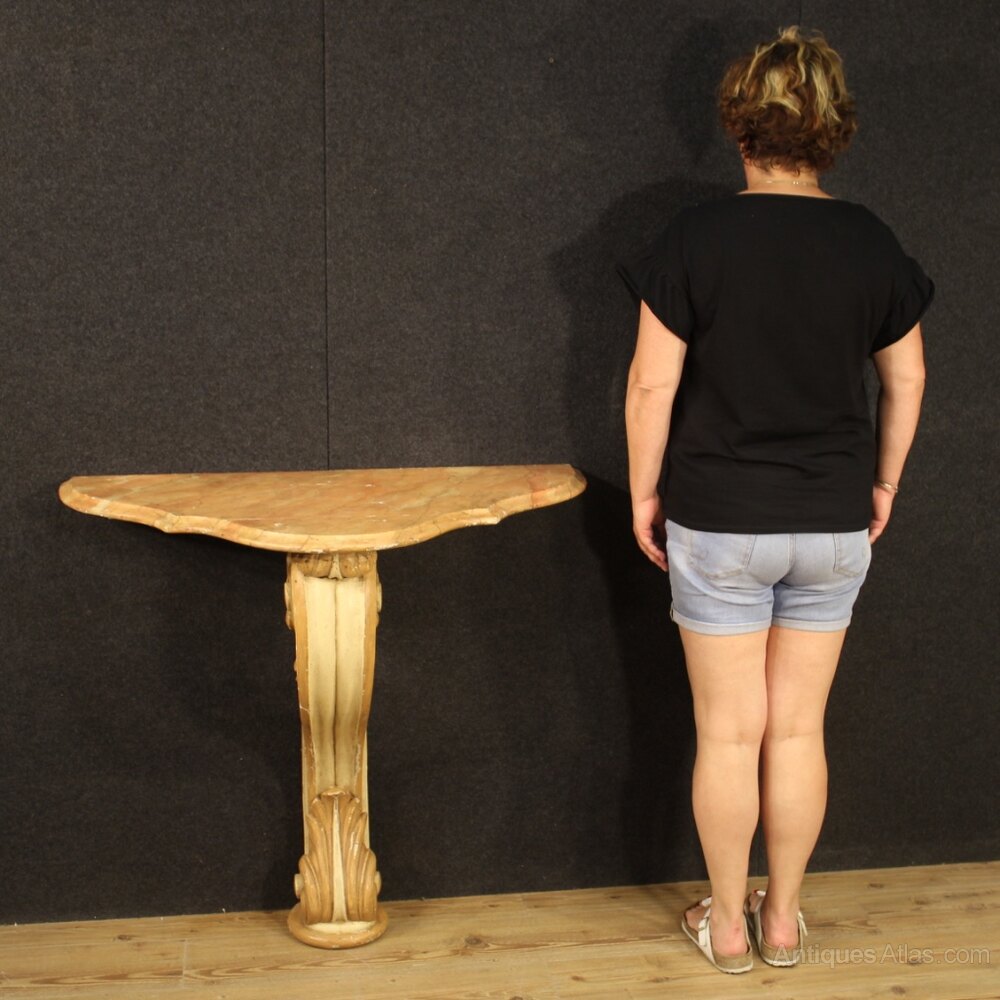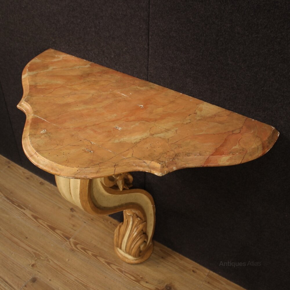 Italian console from the mid-twentieth century. Furniture of beautiful line and pleasant decor in carved, lacquered and painted wood. Wall console, supported by a solid central leg finely sculpted and lacquered, to be fixed to the wall for perfect stability. Furniture equipped with a good size lacquered faux marble lacquered top and service with some signs of aging and wear (see photos). Console for antique dealers and interior decorators that has some color drops (see photo), in beautiful patina. Structurally healthy, overall in good state of conservation.