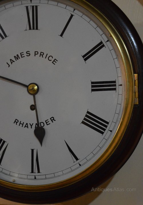 A Welsh fusee dial antique clock with a 12" painted dial with a cast brass bezel surround in a mahogany case. An 8-day duration timepiece fusee mechanism. James Price of Rhayader is listed in Peates "Clock and Watchmakers in Wales" book as working 1830-1887. This example is circa. 1840.
