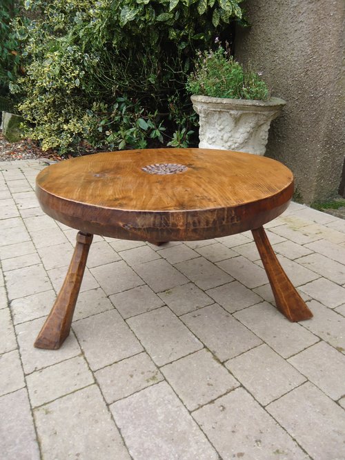 Arts & Crafts burr elm coffee table made by Jack Grimble of Cromer around 1970. It stands on three legs and the top is a superb piece of elm and is 8cms thick. It has a Tudor rose carved into the centre and Jack's signature is carved into the underside. A lovely piece of craftsmanship from a maker no longer with us.