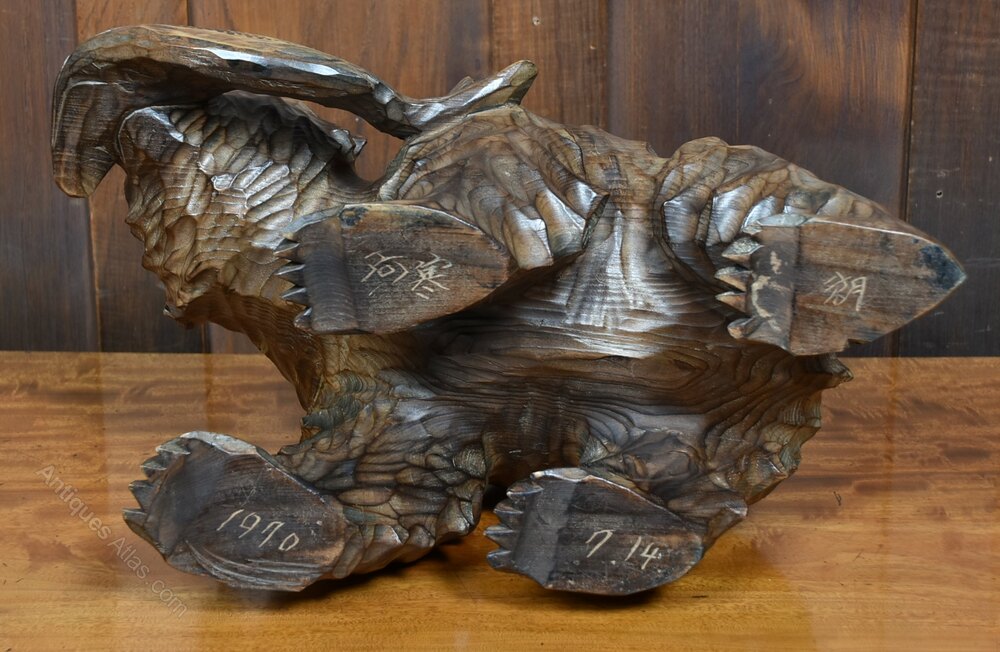 A striking Japanese Kibori Kuma, hand-carved from richly stained wood and depicting a bear in mid-stride with a salmon gripped in its jaws. The bear’s fur is rendered in rhythmic, flowing cuts, while the fish is delicately detailed with visible scales and fins, capturing a vivid moment of instinct and motion. This particular piece bears inscriptions on each paw, including a date—1970.7.14—and Japanese characters that may indicate the artisan’s name or workshop. The underside reveals the carving marks and grain, affirming its hand-crafted origin. Likely produced in Hokkaido, this sculpture reflects the enduring tradition of Kibori Kuma: a fusion of Ainu reverence for nature and early 20th-century Japanese folk art, inspired by Swiss Black Forest carvings.