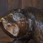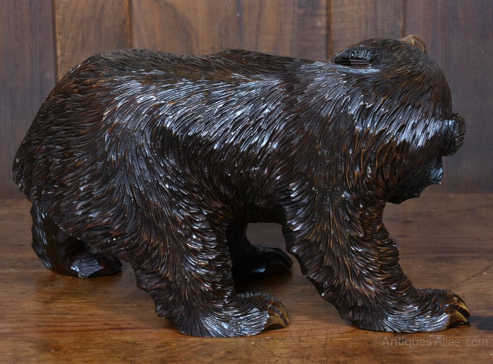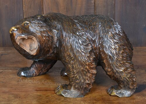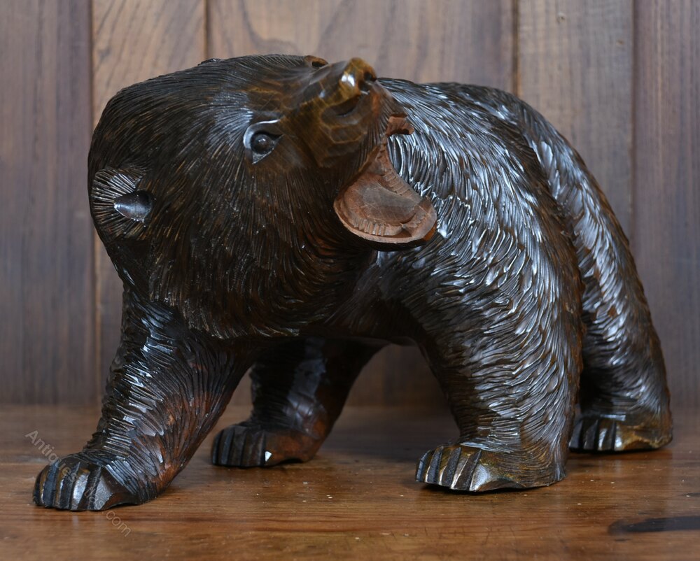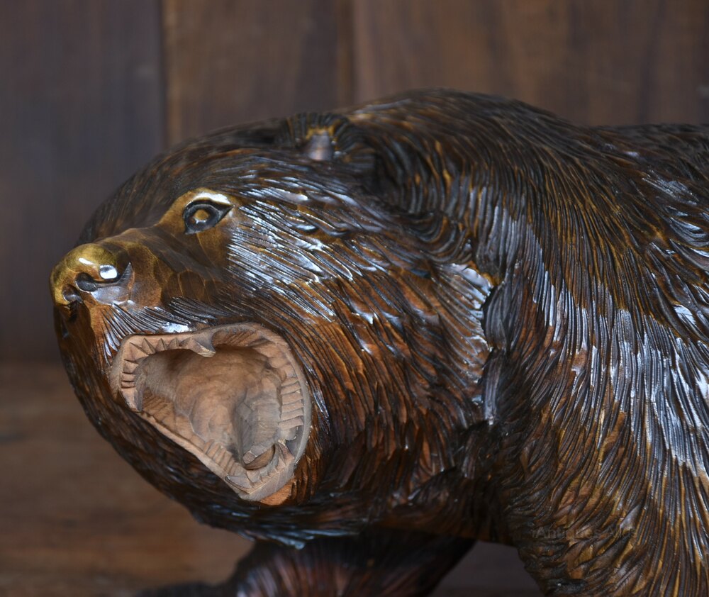 A well-detailed Japanese wooden bear, carved in a dynamic walking pose with open jaws and expressive features. The fur is deeply incised, and the musculature carefully rendered, showcasing strong craftsmanship and naturalistic style. The wood has a warm patina and the overall condition is good, with minor surface wear consistent with age. A decorative and characterful piece, ideal for collectors of folk art, Japanese craft, or wildlife sculpture.