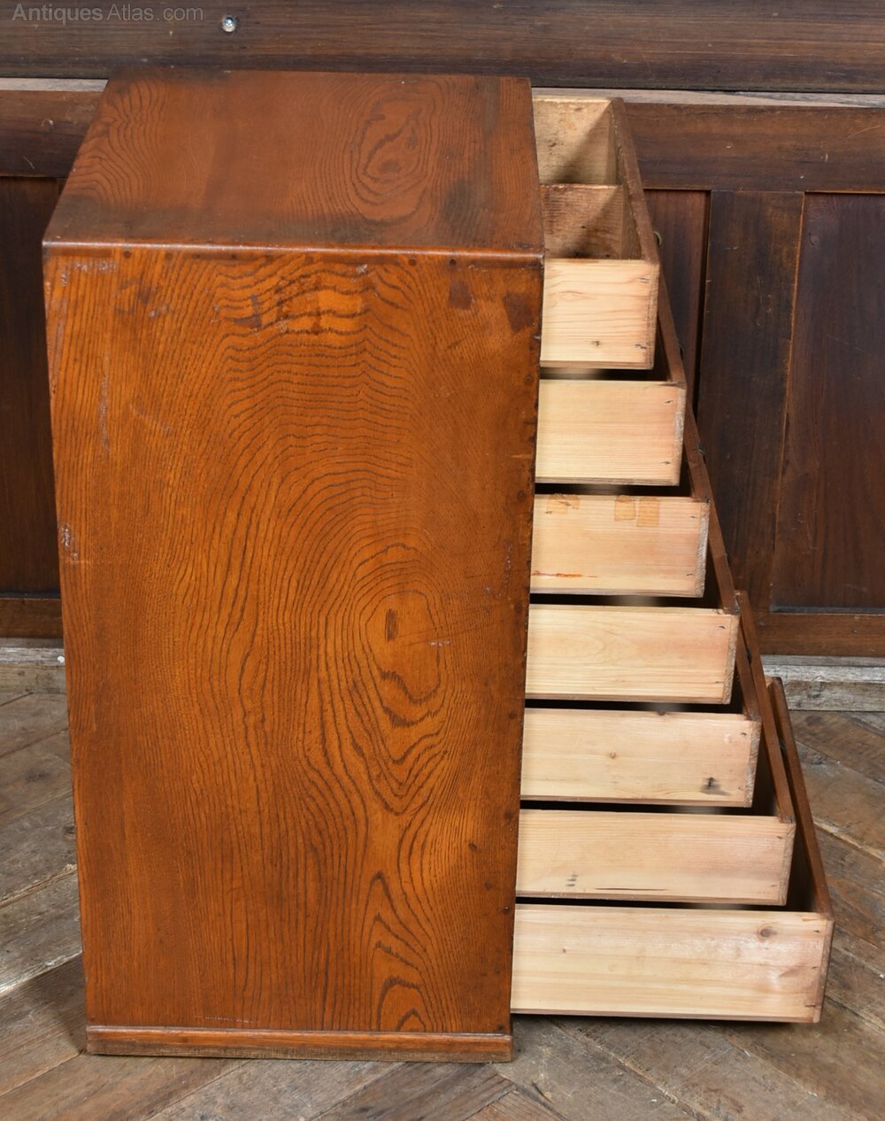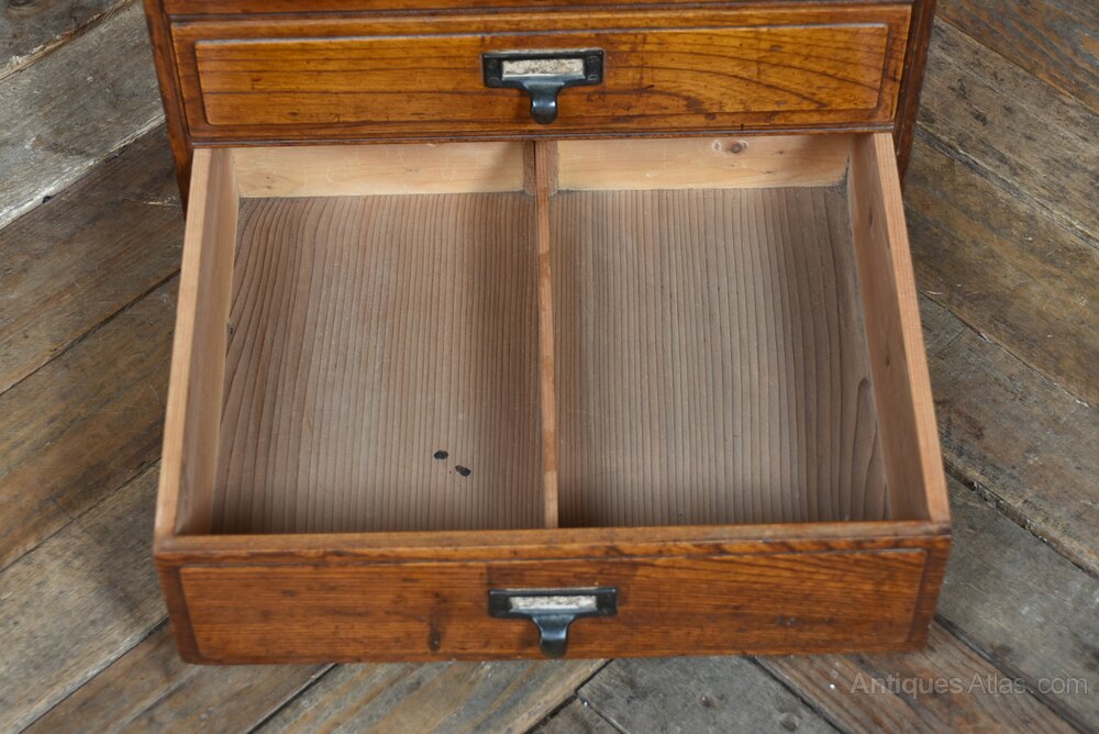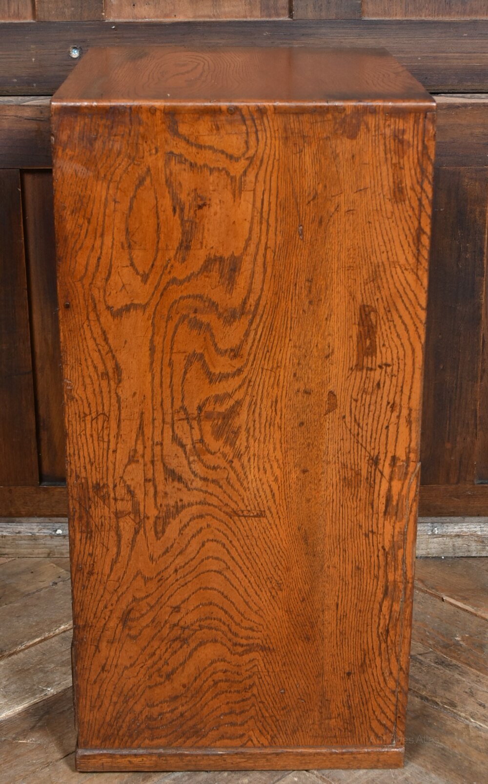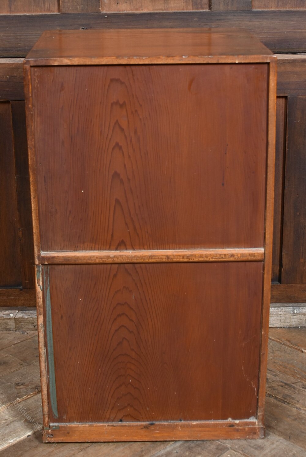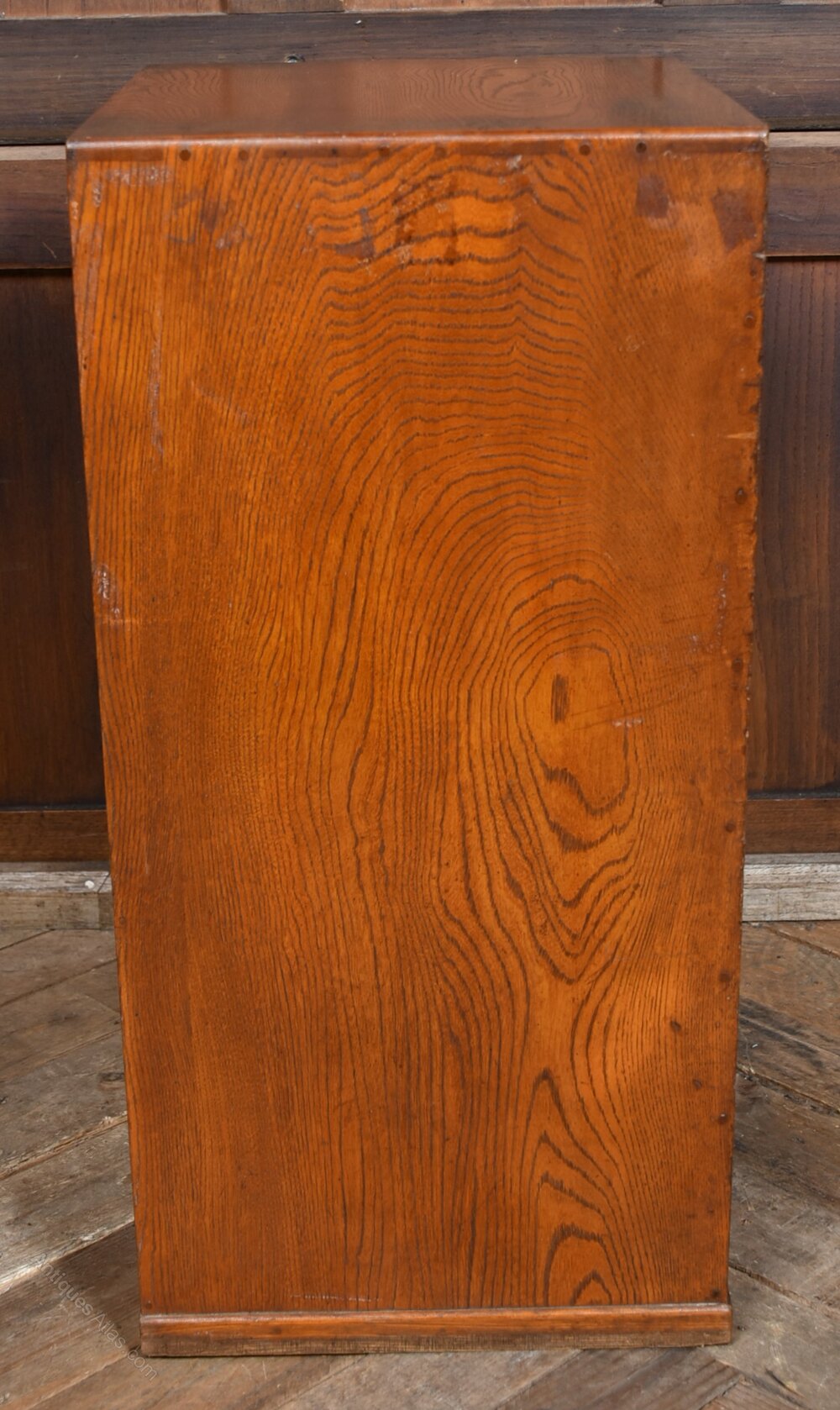 A beautifully made Japanese keyaki filing cabinet in excellent antique condition. It features seven graduated drawers, each retaining its original brass pull handle. All drawers are fitted with a central divider creating two equal compartments, and the divider in the bottom drawer can be removed to accommodate A4 paper or a laptop. As with all antique pieces, there are minor imperfections, but it remains a solid and very charming little set.