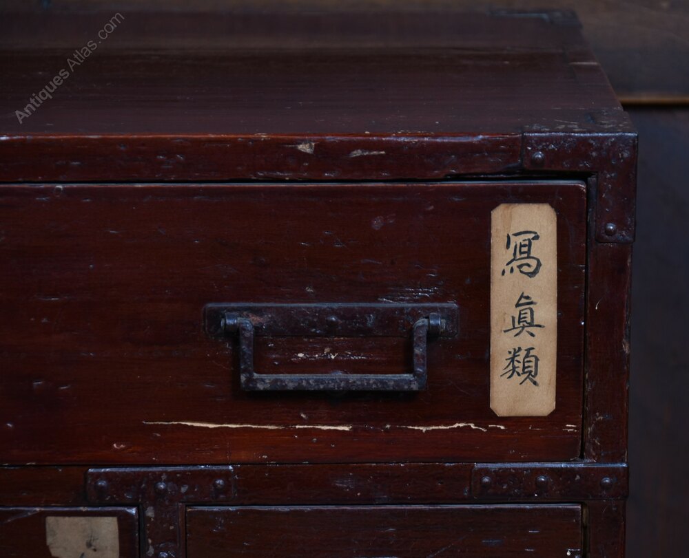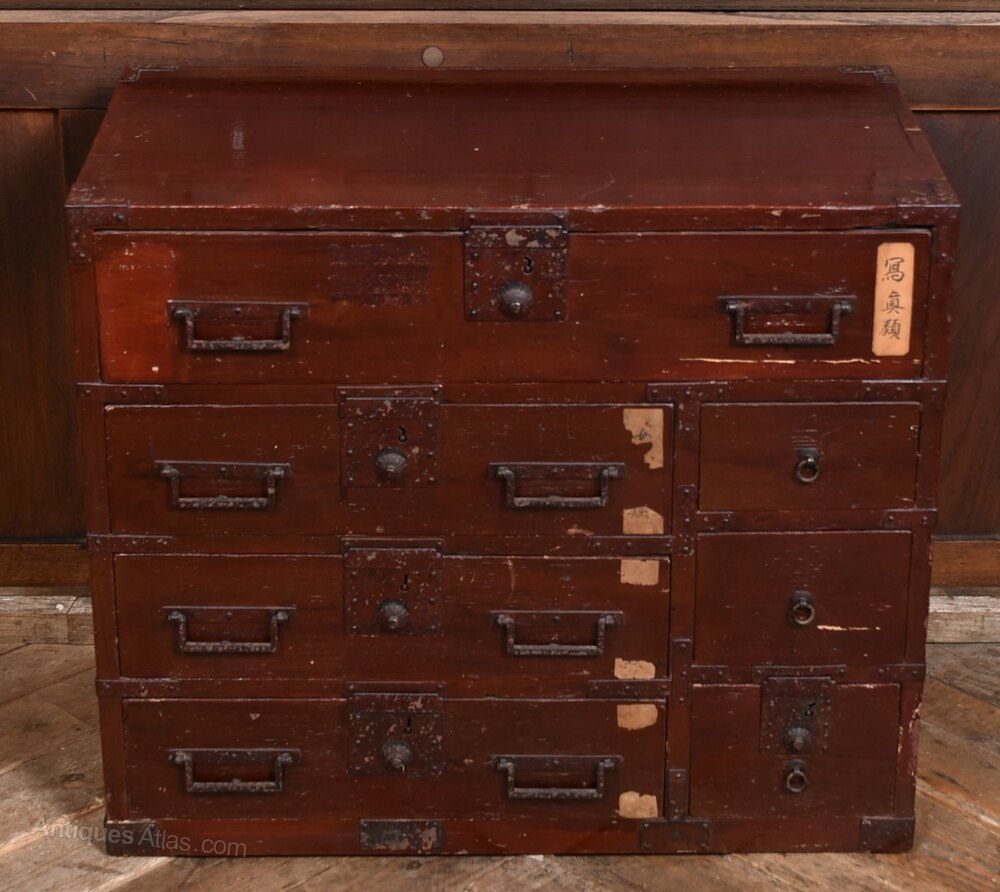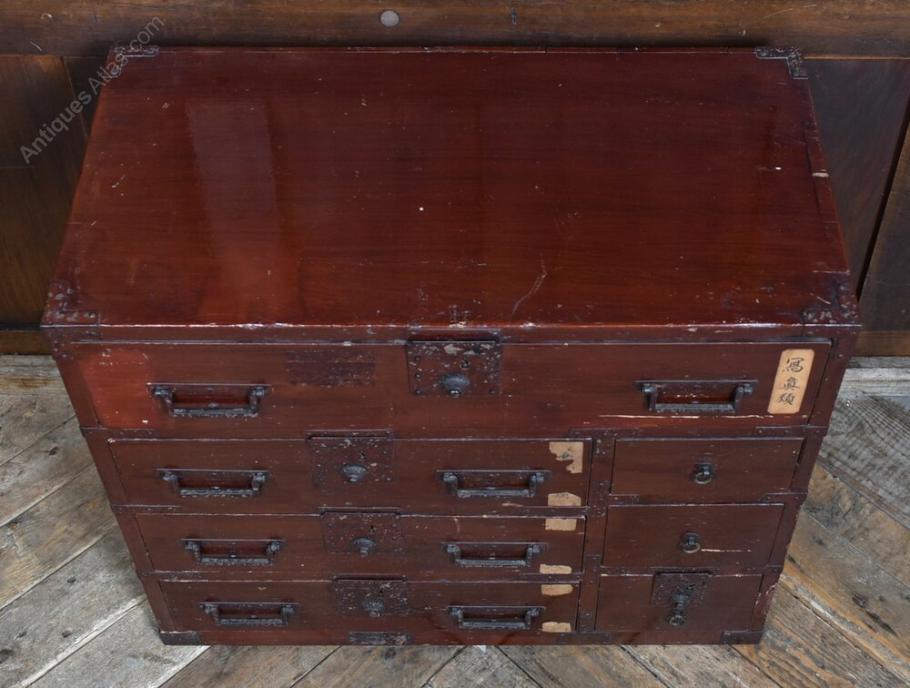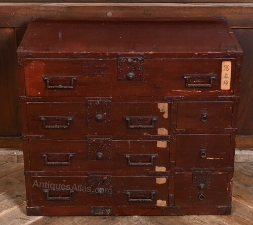 A striking Japanese Tansu chest, distinguished by its vibrant red lacquered finish and practical yet artful arrangement of drawers. Comprising drawers of varying sizes. Each drawer is fitted with traditional iron handles and escutcheons, their aged patina complementing the richly worn lacquer. The front has a label bearing Japanese script suggest provenance and cultural significance. The chest’s compact form and compartmentalised design reflect its original use in merchant or household settings, where portability and organisation were paramount. A fine example of Japanese craftsmanship, ideal for interiors seeking a bold accent with historical depth and functional charm.