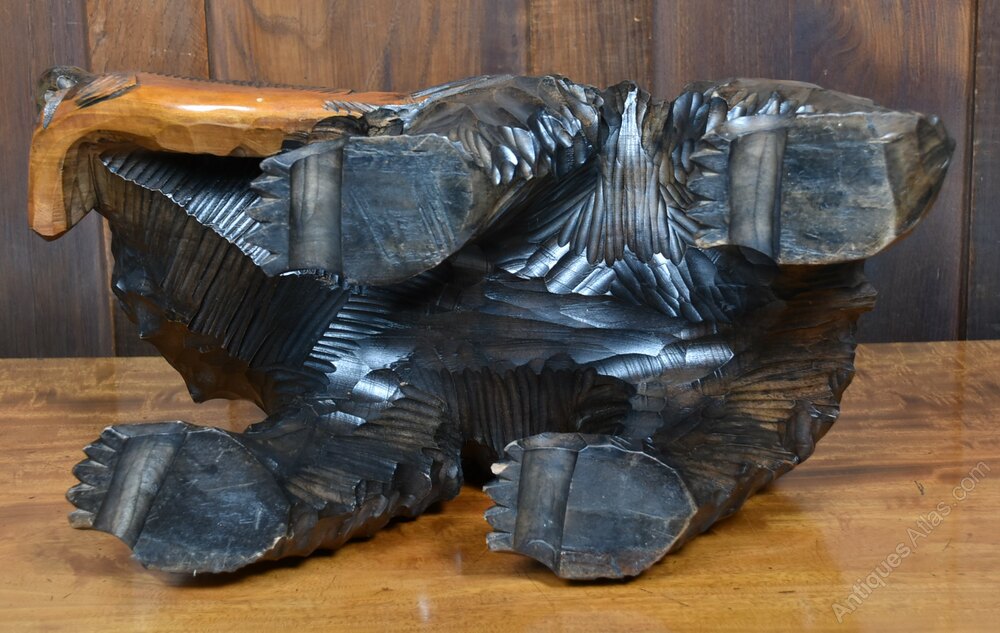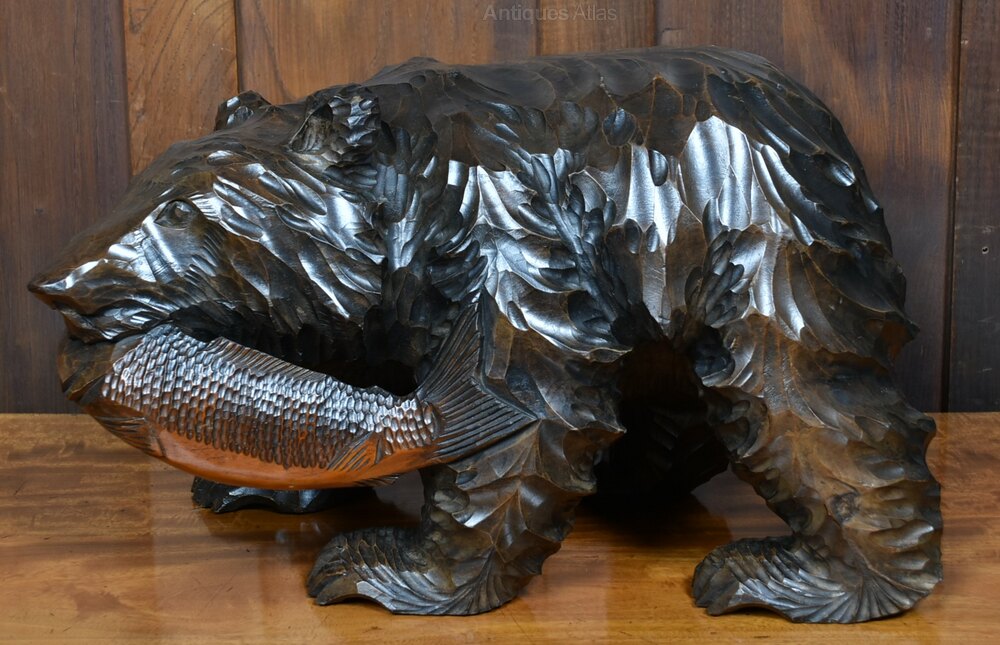 A finely carved Japanese Kibori Kuma, crafted from richly grained wood and depicting a bear mid-stride with a salmon clasped in its jaws. This expressive sculpture hails from Hokkaido, where such carvings became popular in the early 20th century as a fusion of indigenous Ainu artistry and Japanese folk tradition. The bear’s fur is rendered with dynamic, flowing cuts, while the fish is delicately detailed, capturing a moment of primal vitality. A striking piece of cultural heritage and craftsmanship.