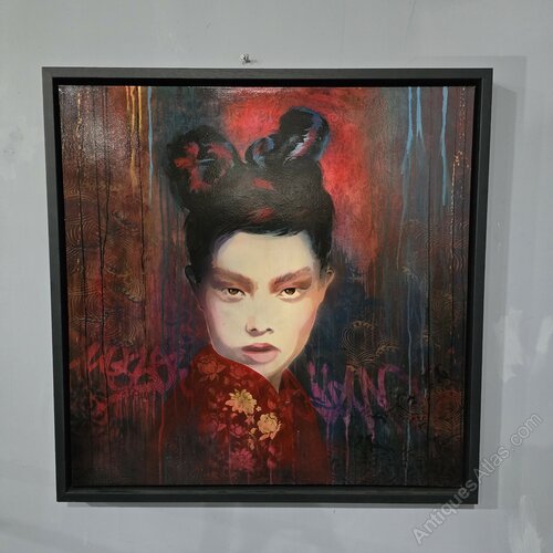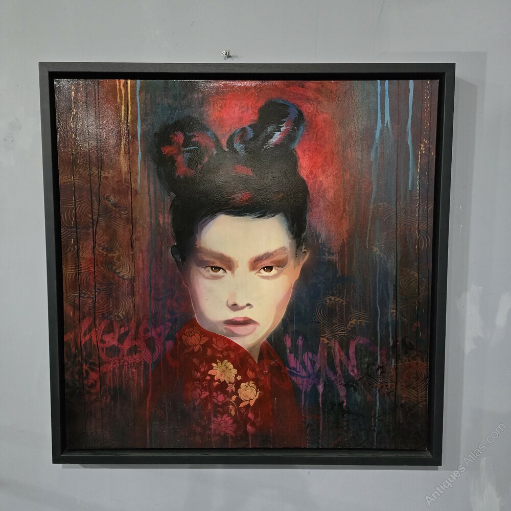 Original large mixed media on canvas, graffiti style portrait of a girl by three British street artists, signed Troika to the verso.