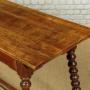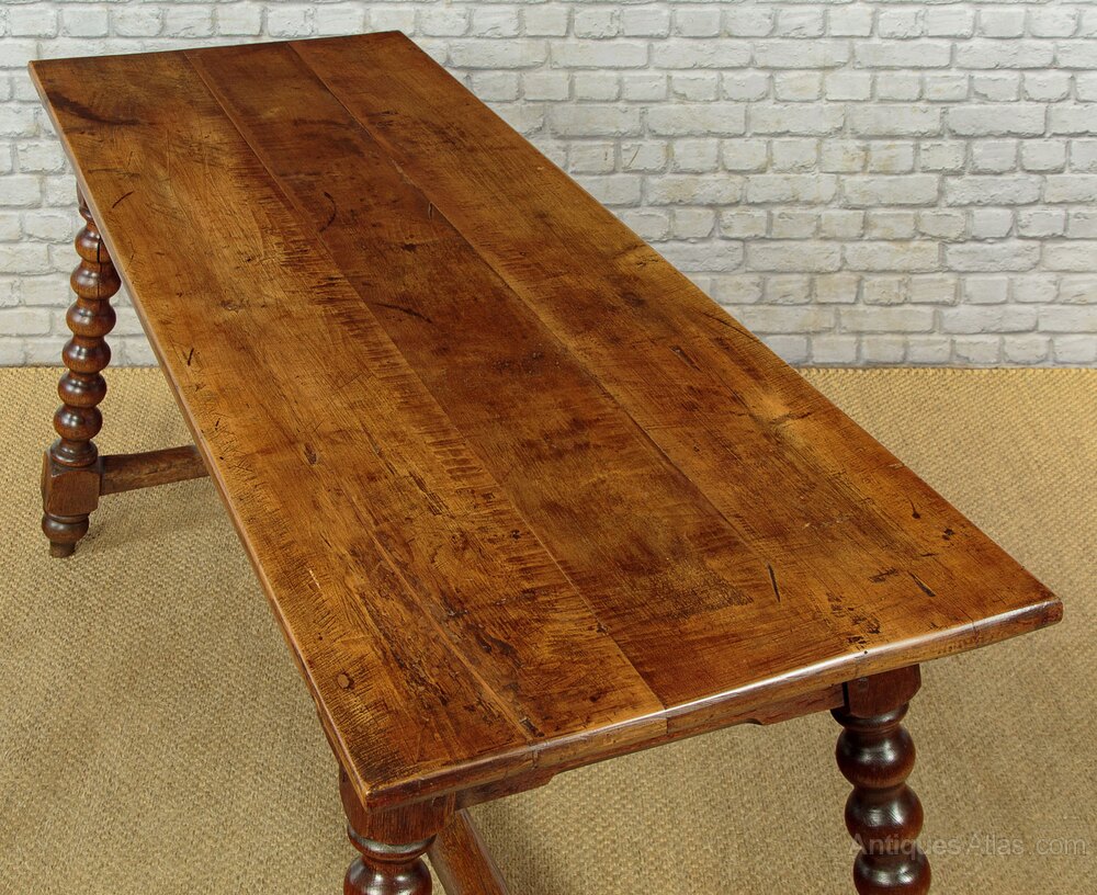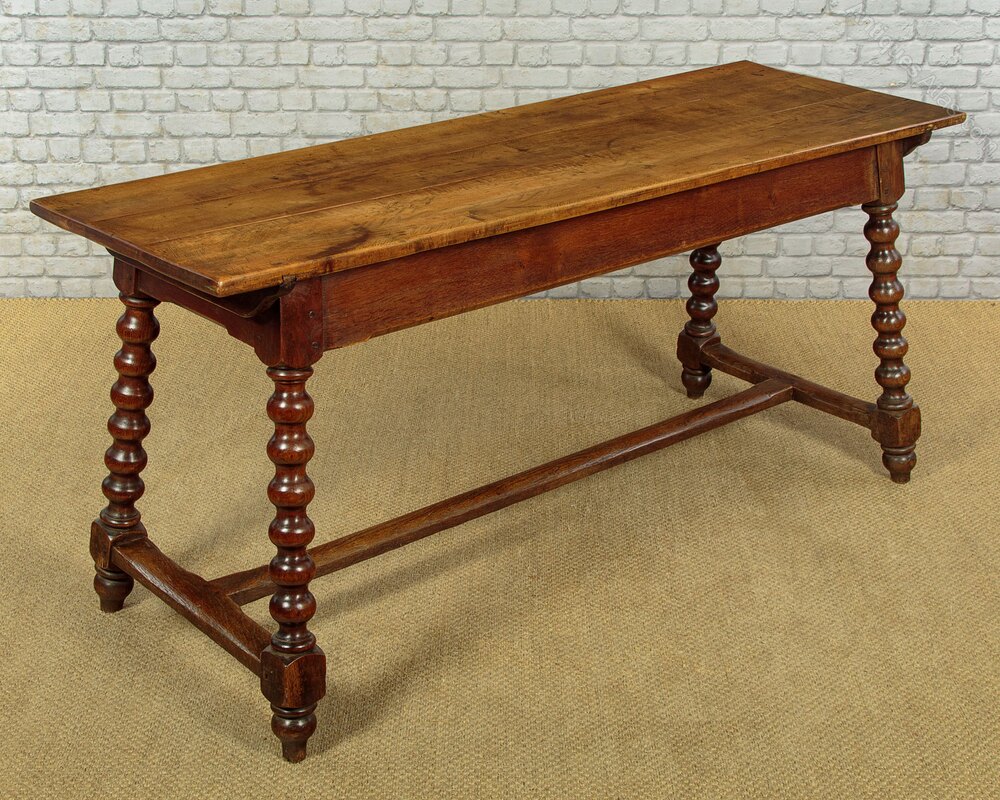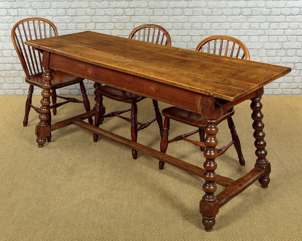 Unusual slim kitchen dining table c.1860. 23" x 66.5" top made from three fruitwood, or possibly sycamore, boards. On an tapering oak base with a chamfered apron (height 24½" below) and superb bobbin turned legs, splayed for stability and joined with a low H stretcher. Very good colour and condition, cleaned and waxed in our workshops.