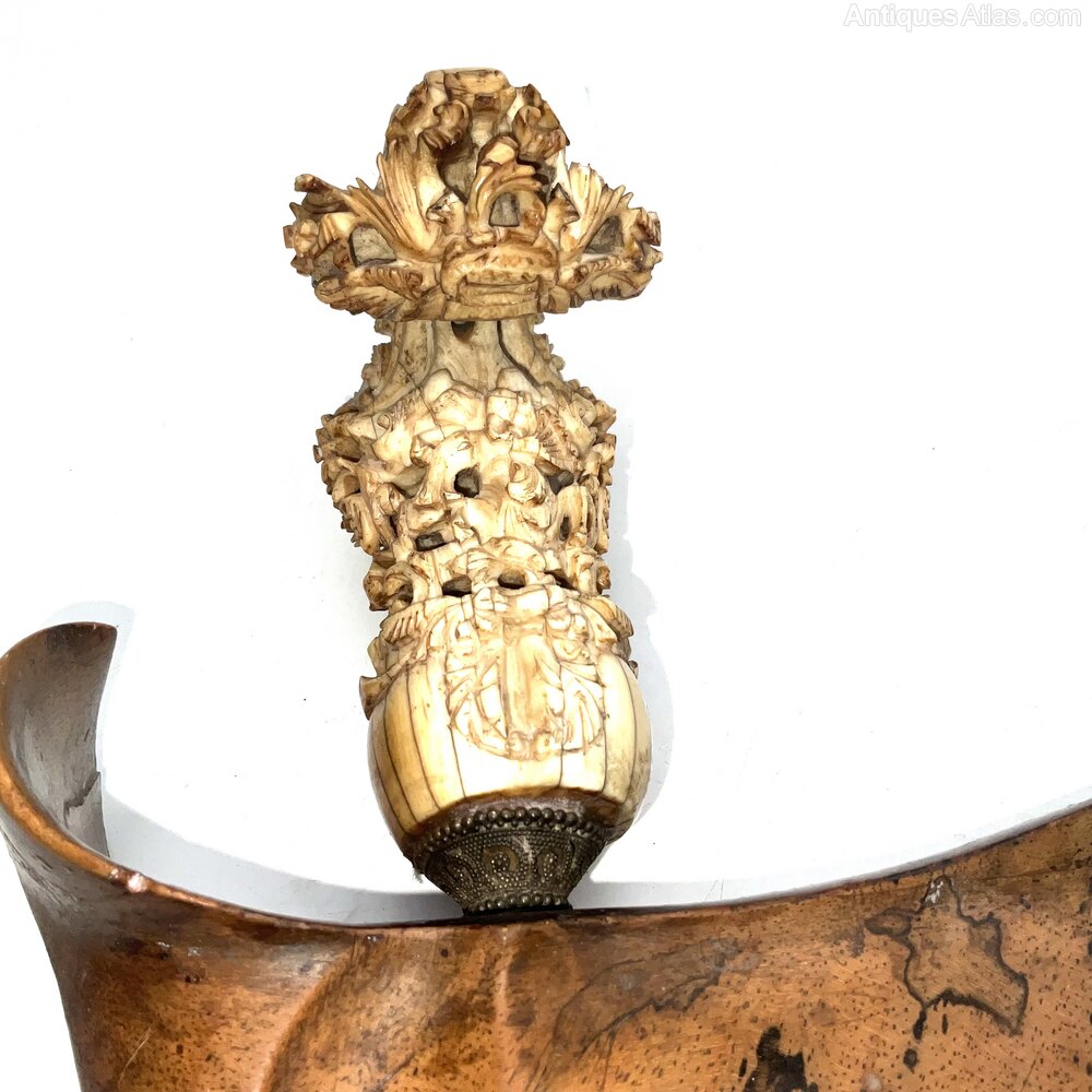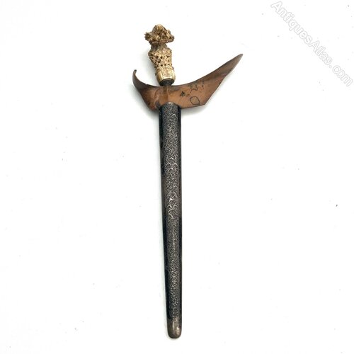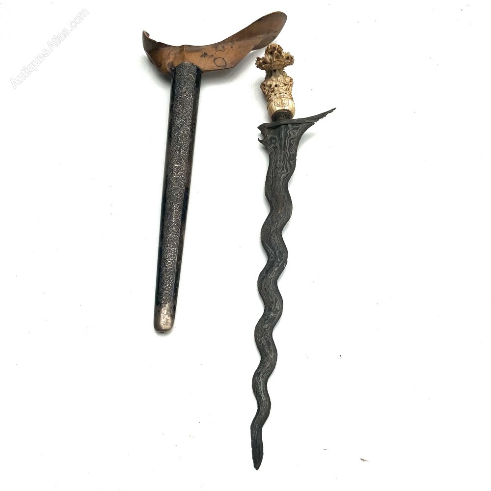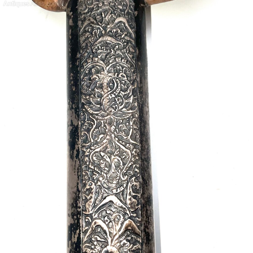 Bone carved Grip silver scabbard blade is remarkable, overall conditions good though showing some wear, this is an important item from Indonesia owned by an important family length in total being 49 cm width across guards 19 cm depth of 6 cm at top of the bones grip. Offering free worldwide delivery reference UMSC. Tel: +44 7505 165 843 We accept online payments for all our items listed: Bank transfer cash on collection or if wishing over the phone using your debit or credit cards, also doing layby payments plan, or email giving your address details & contact number and we shall send you your items invoice to make payment with your card. Send your request to - john.strong2@gmail.com