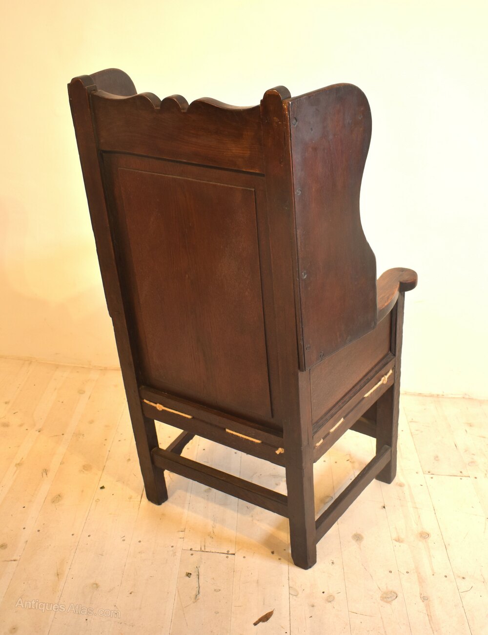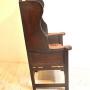 Oak wingback lambing chair. 18th century of pegged construction with roped seat and cushion, in good condition with original colour and patina.