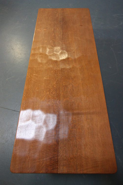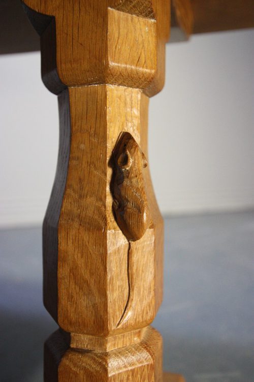 Complete with the expected adzed surface to the oak top and the little carved mouse, sneaking up one table leg.