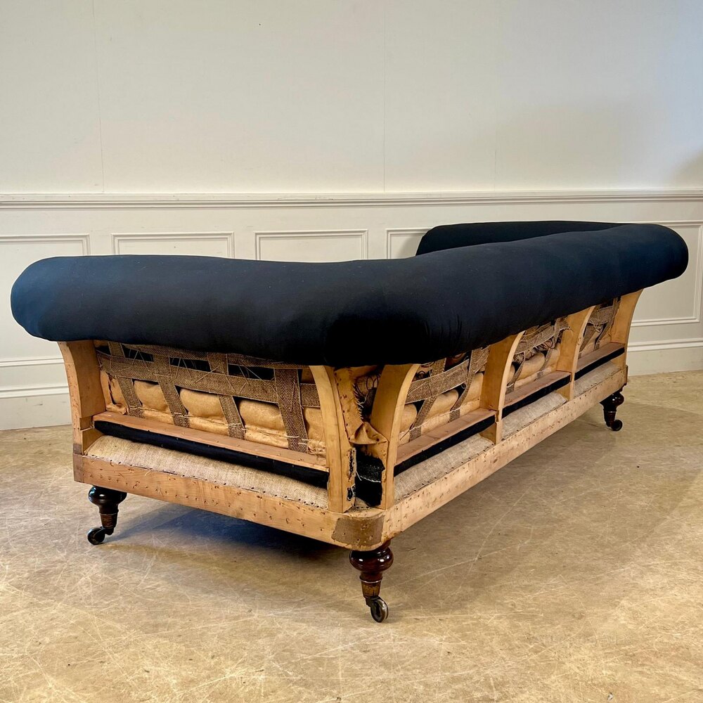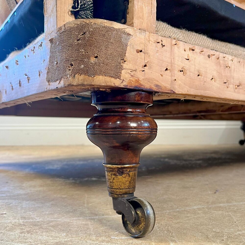 A wonderful large 19th century country house sofa. Having a sprung back and seat, retaining the original horsehair and down feather cushions. The whole raised ring turned walnut legs with the original high quality gilt lacqered brass castors. In superb condition throughout, really comfortable and now ready for its new topcoat. English, Circa 1890.