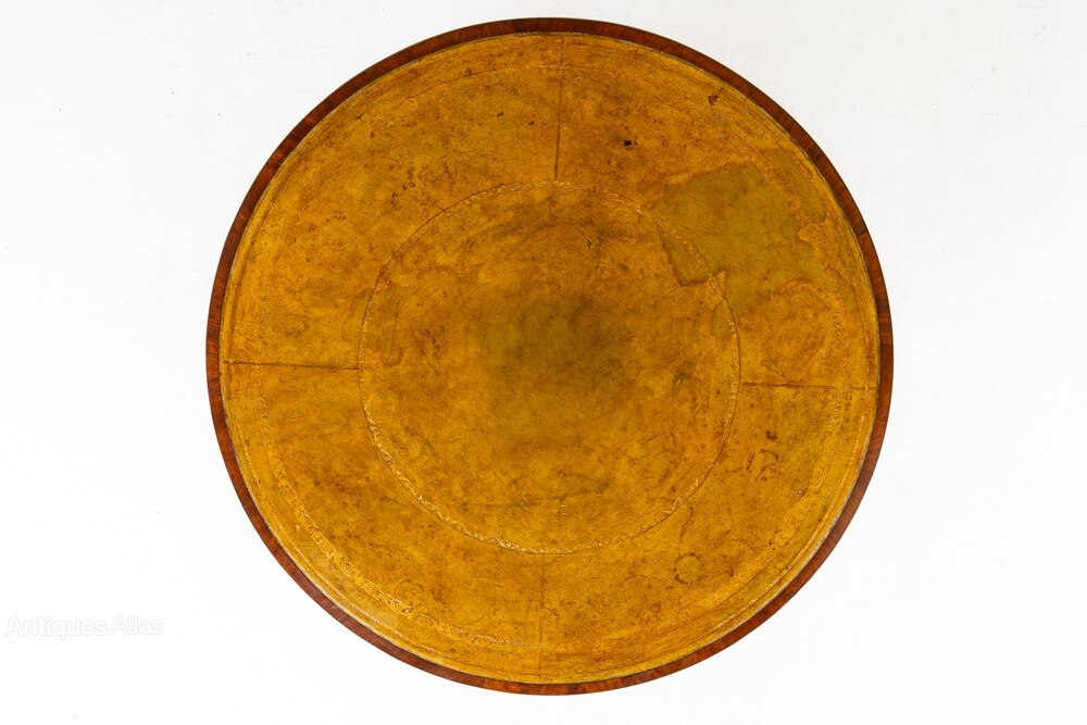 Of of large size and good proportions and interesting column support, this is a beautiful example of a regency drum table. It has four working drawers and four dummy drawer fronts, all with cast gilt brass handles with flower and beaded decoration. The top retains the original faded and patinated leather insert, with almost all of its intricate and attractive gilt tooling. The collar on the column support has very distinctive reeded detailing, often associated with the Gillows firm. The hipped cabriole legs seen on this table are also seen on various marked Gillows pieces and it is therefore quite likely that they were the makers of this particular table. The quality of the mahogany used throughout is certainly of the level expected of a top quality firm. The legs terminate in paw form castor caps which are very finely cast and nicely finished.