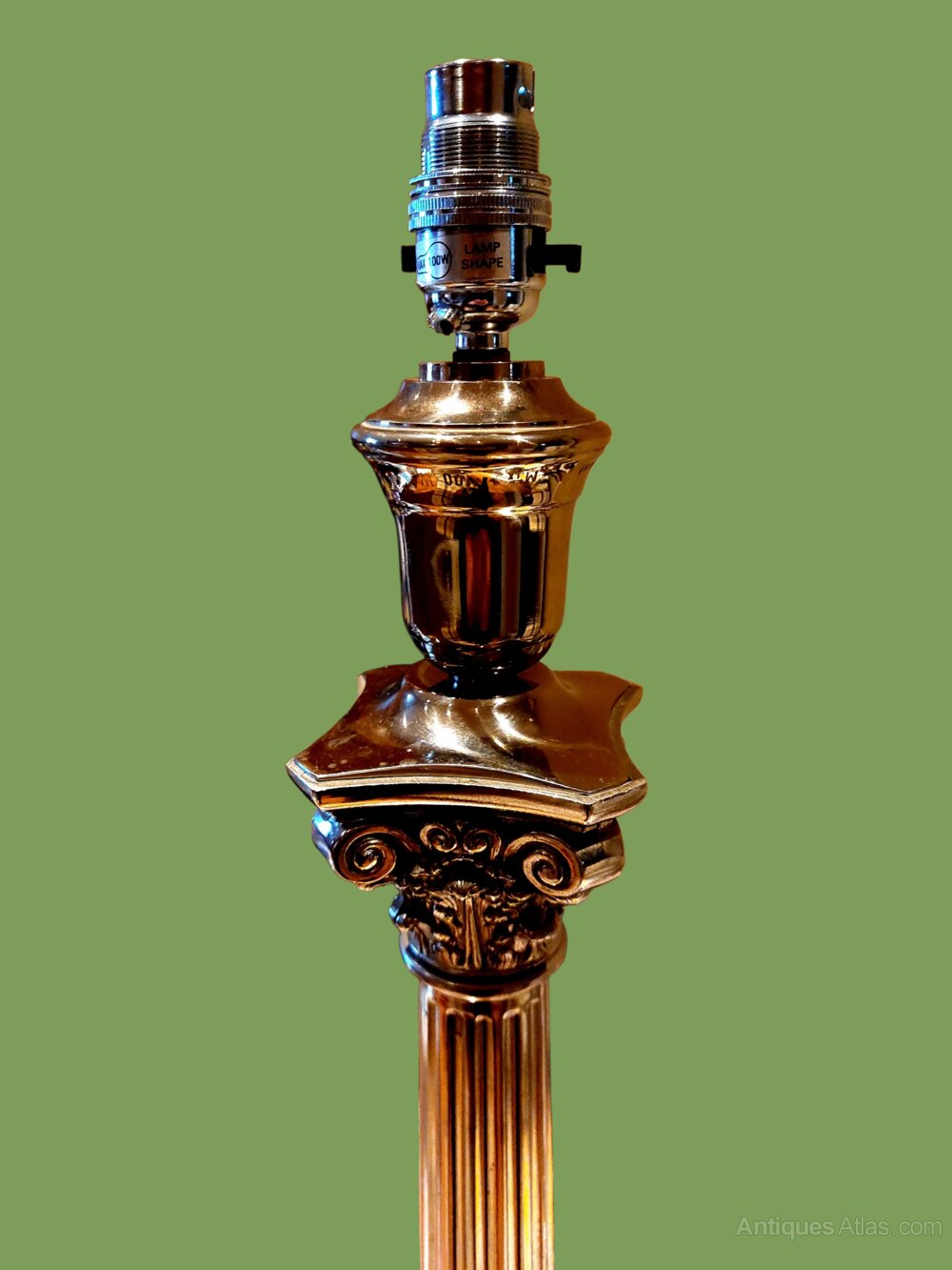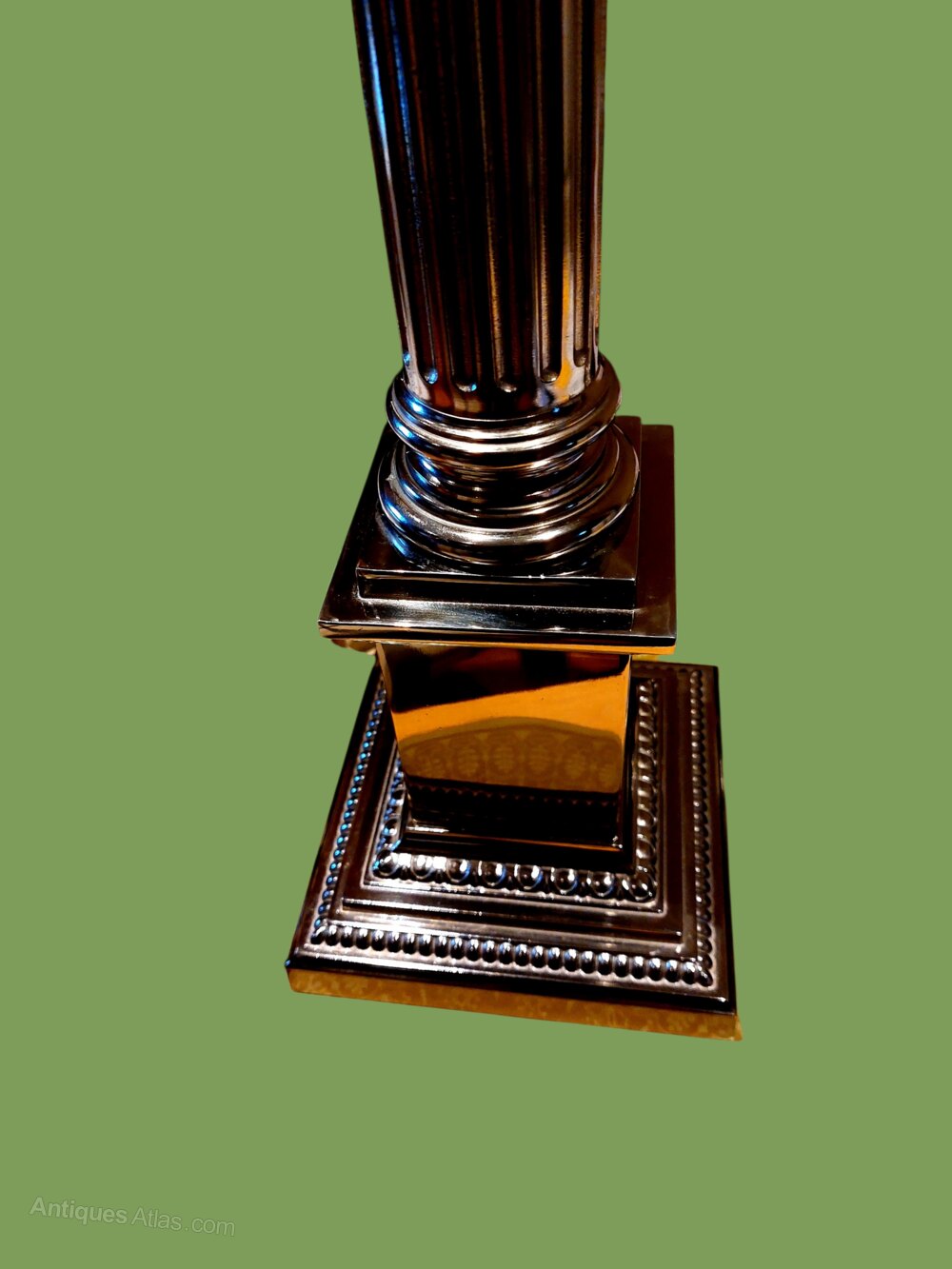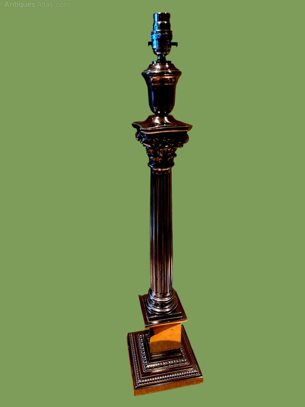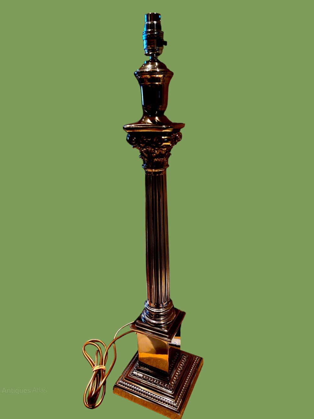 An impressive very large silver plated Corinthian column table lamp of the best quality. Not tremendously old probably from the late 20th century but of the very best quality. Standing an impressive 28" tall on a 6" square base. Weighs a hefty 4.8 kilos. Wired in gold flex and ready to use.
