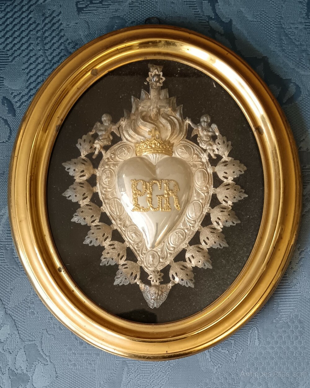 A rare and authentic Italian Ex-Voto from the late 19th early 20th century, depicting the Flaming Sacred Heart within an oval gilt frame behind glass.