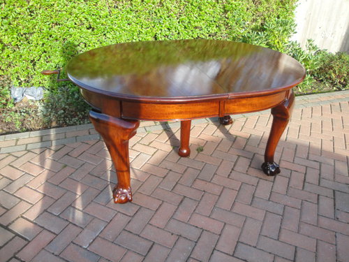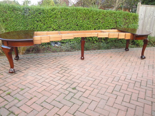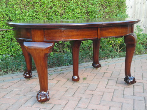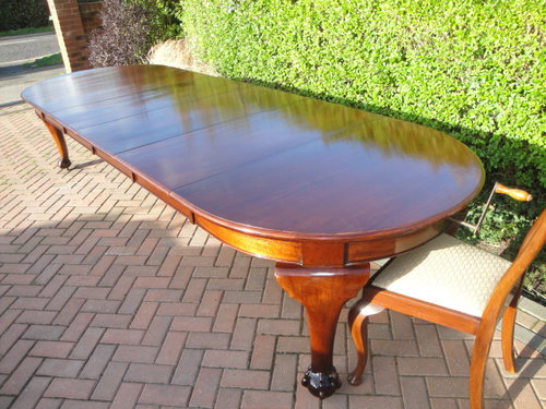 Offered for sale is this superb quality large oval mahogany Chippendale style extending dining table measuring 60" x 48" extending to 142" x 48" with four leaves and dating to about 1920. The oval extending dining table has a moulded edge above a skirt on cabriole supports with ball and claw feet and brass castors. The table will seat 12 - 14. The table is in excellent showroom condition having been sympathetically repolished and the extending mechanism works very smoothly. The table is a rich mellow brown colour and has a makers plate on it " P E Gane ". This company were cabinet makers who produced high quality antique furniture in Cardiff. We specialise in antique dining suites trading from our own showroom in Wokingham, Berkshire . Over the past 30 years we have sold over a thousand sets of chairs along with hundreds of dining antique tables to satisfied customers. All of our stock maybe viewed by appointment at your convenience and we offer an unconditional money back guarantee if you are not happy with the antique furniture. We can arrange delivery and accept most major cards. See our other stock for a set of chairs to go with this table.