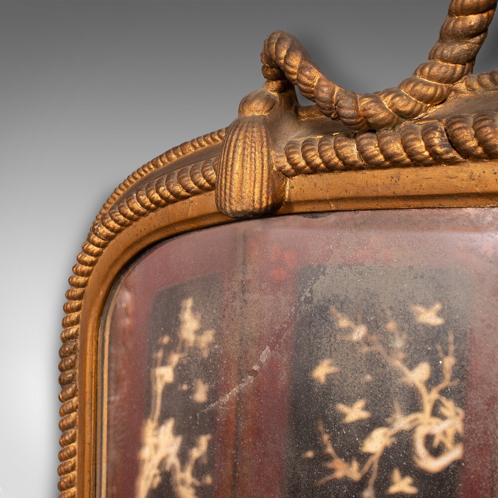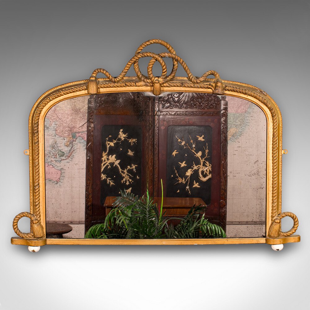 This is a large antique overmantle mirror. An English, giltwood and mercury glass lounge mirror, presenting distinctive nautical taste, dating to the early Victorian period, circa 1850.