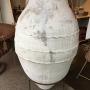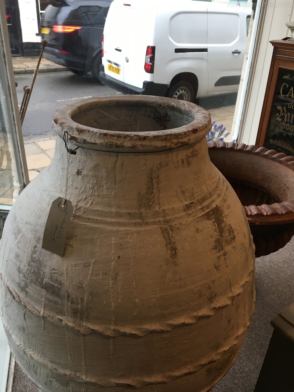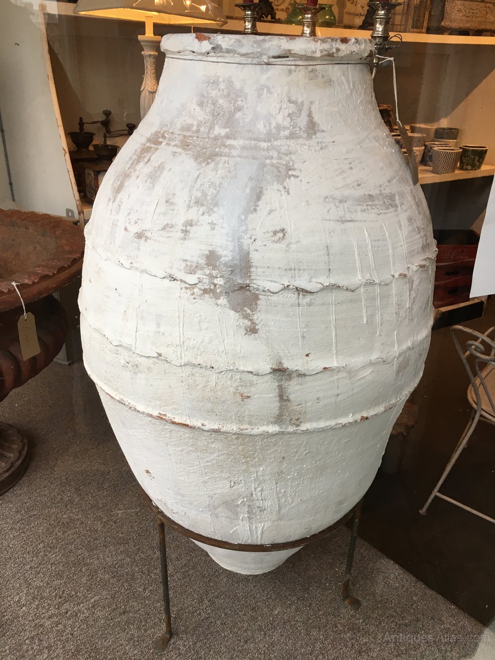 They get larger this one is a great size and shape it’s got good rope work around the top and comes with a stand it’s been painted white at some stage it has a really pleasing shape and will look good in any setting a hundred years old plus would have been used for storage fruit oil it would have had a cloth covered plug in the top held with a rope around the neck.