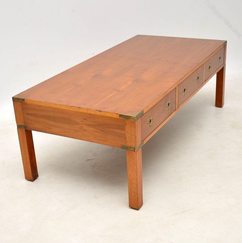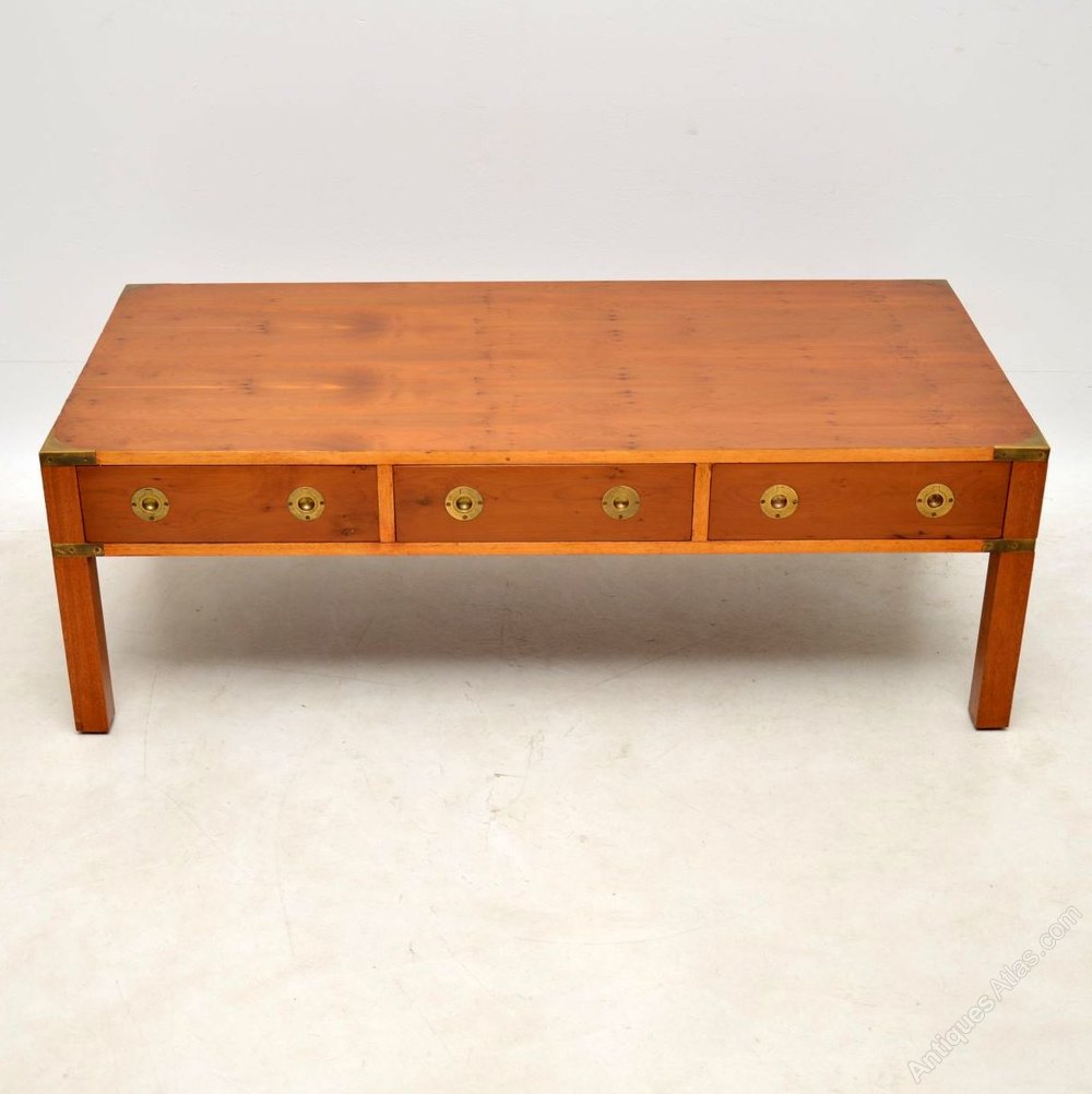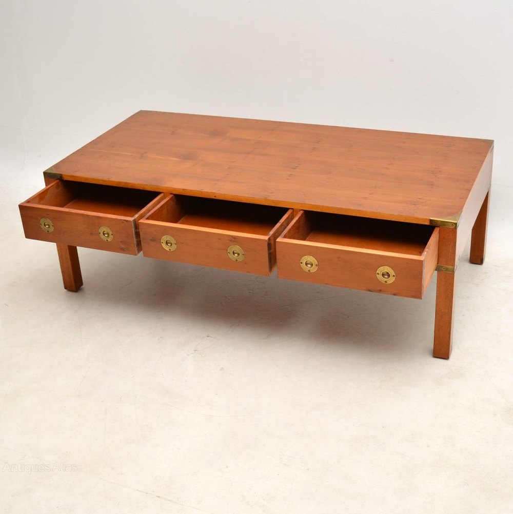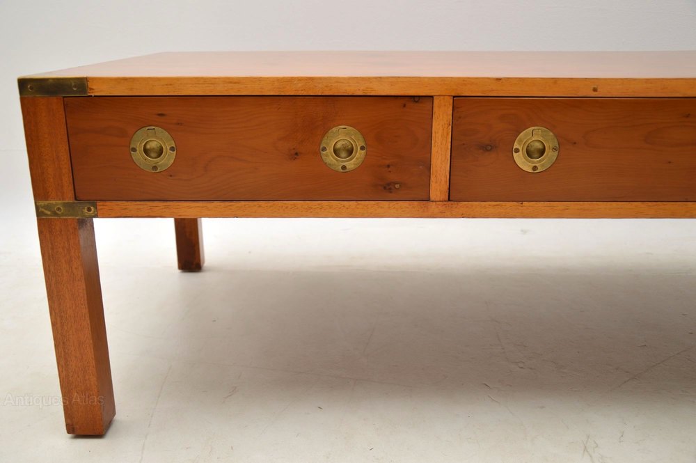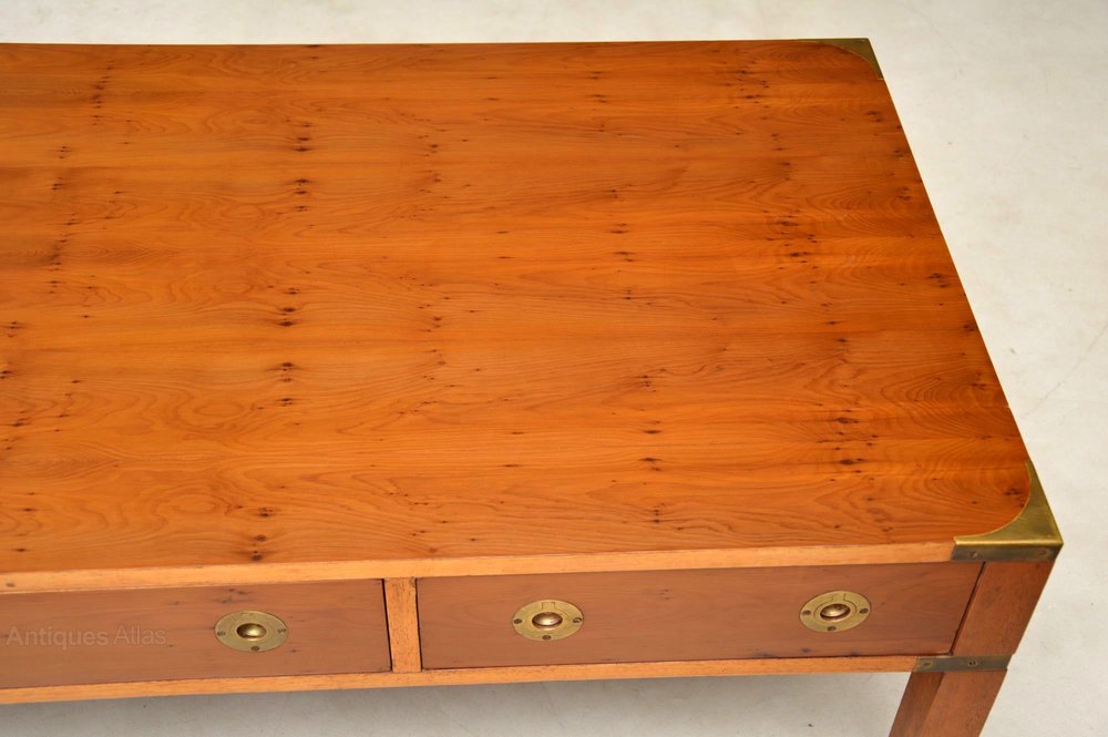 Large Antique Campaign style coffee table in yew wood with three drawers on one side & dummy drawers on the other side. The drawers have military style inset brass handles & there are brass fittings on the corners too. This coffee table is of very strong construction & is in excellent condition, having just been French polished. I would date it to around the 1950’s period.
