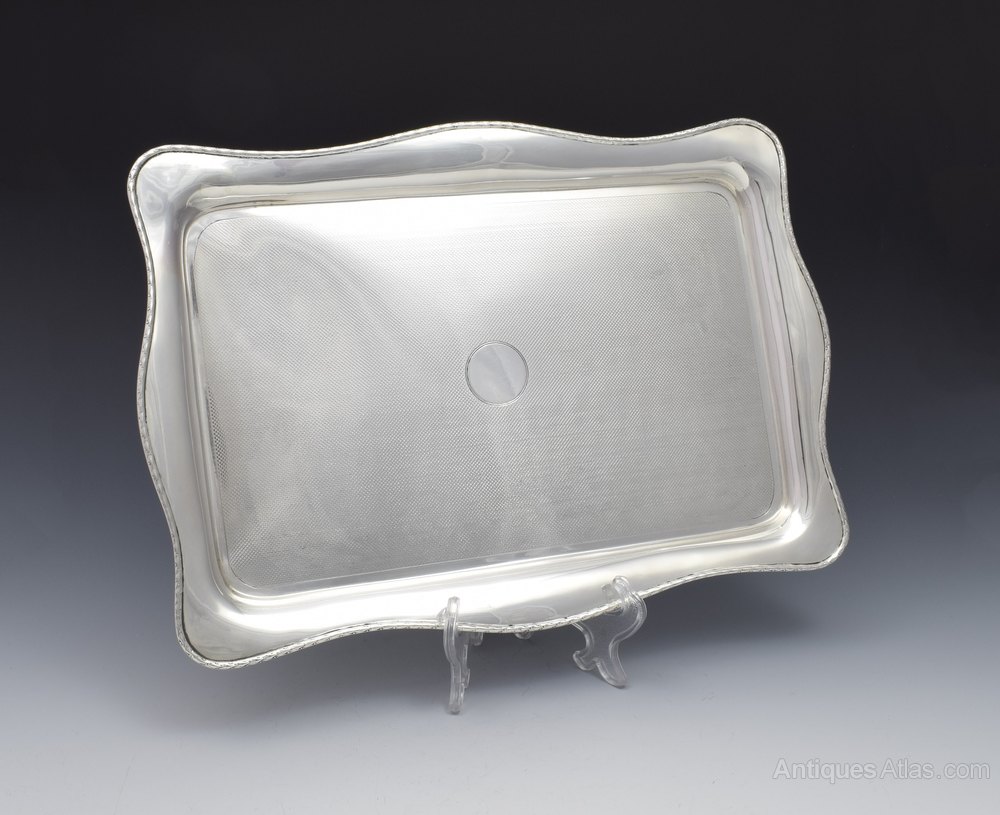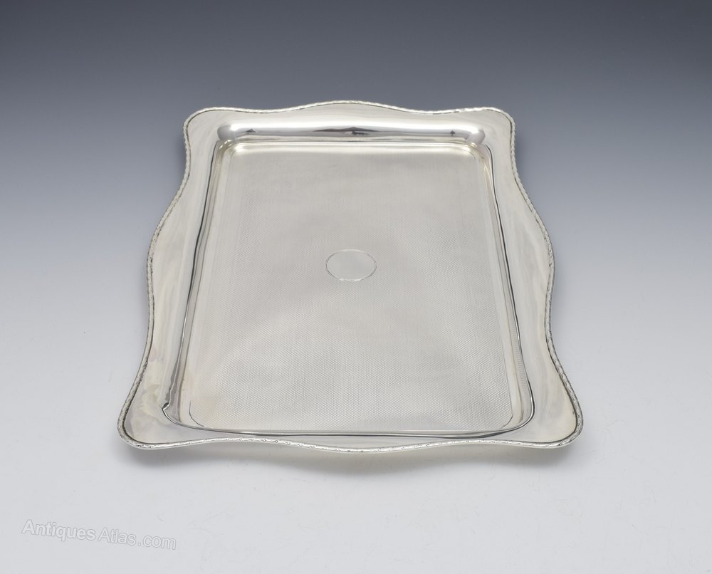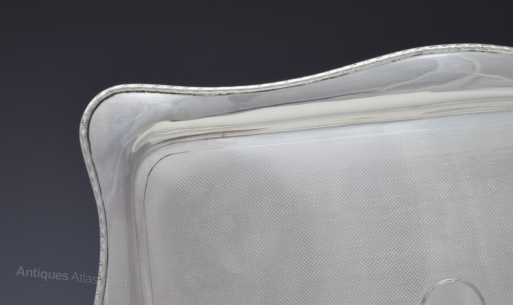 Lovely stylish silver tray with raised, shaped sides with patterned raised rim and machine engraved decoration across the body of the tray with central vacant circular cartouche. Perfect for use on a dressing table, or on a desk, its good size makes it useful for a number of purposes including serving cakes or sweetmeats. Hallmarked for London 1926, makers Robert Pringle & Sons.