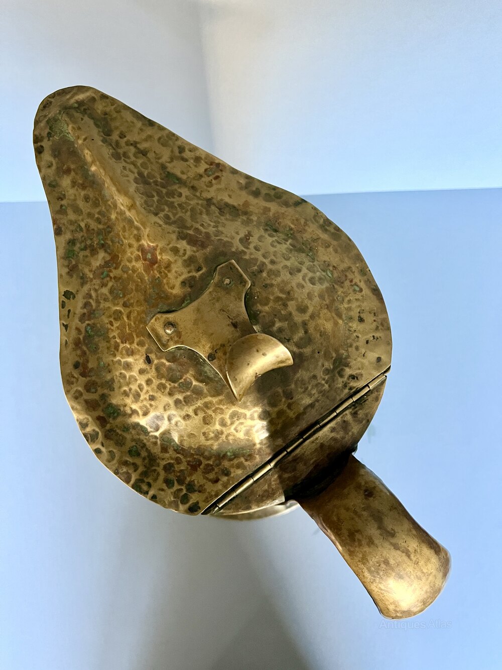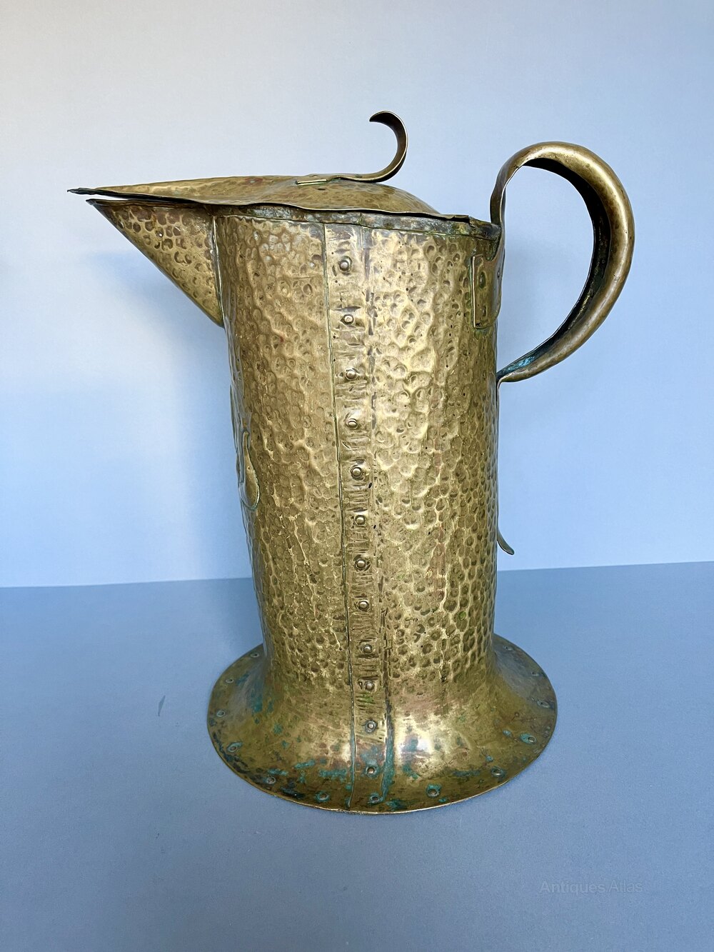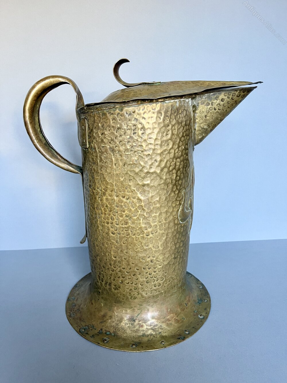 The jug was made in Birmingham by William Soutter & Sons and dates to around the 1880s/90s. The firm began life as Soutter & Hicks in Birmingham in 1760 becoming William Soutter & Sons around 1800. They were coppersmiths and brass founders and particularly known for their kettles, tea urns and jugs. From the 1870s onwards they produced a range of Art Metalwares, particularly in the Arts & Crafts style. They closed in 1927.