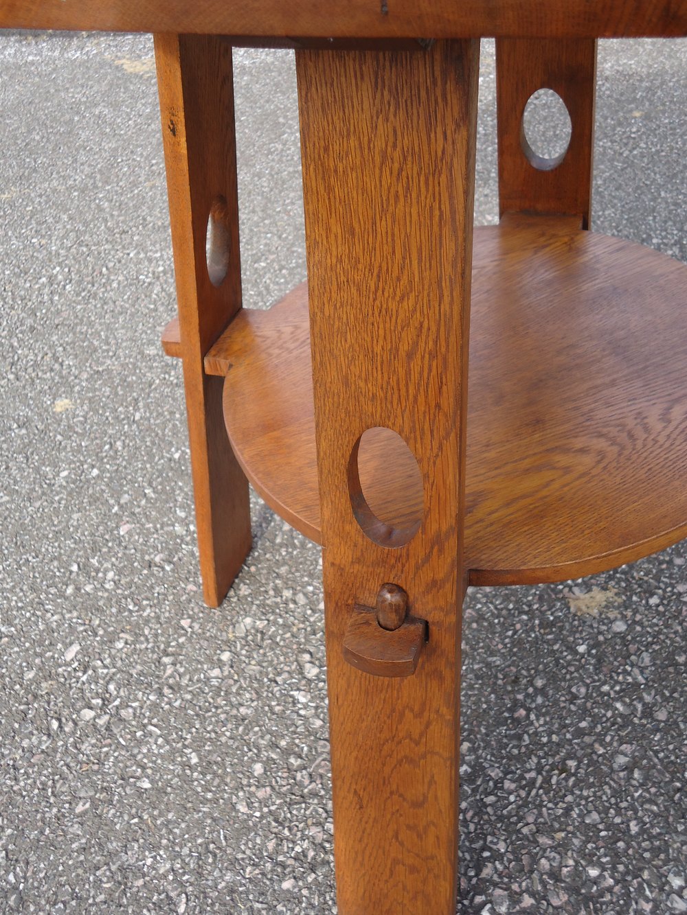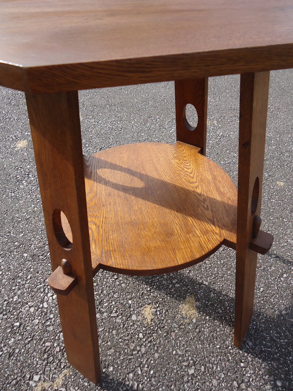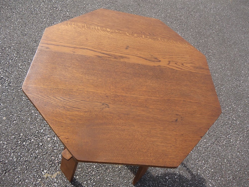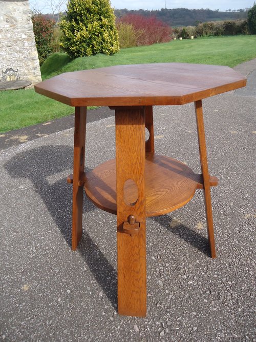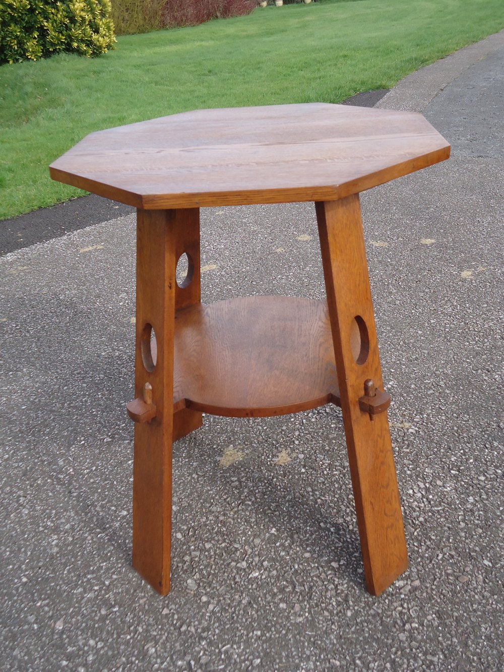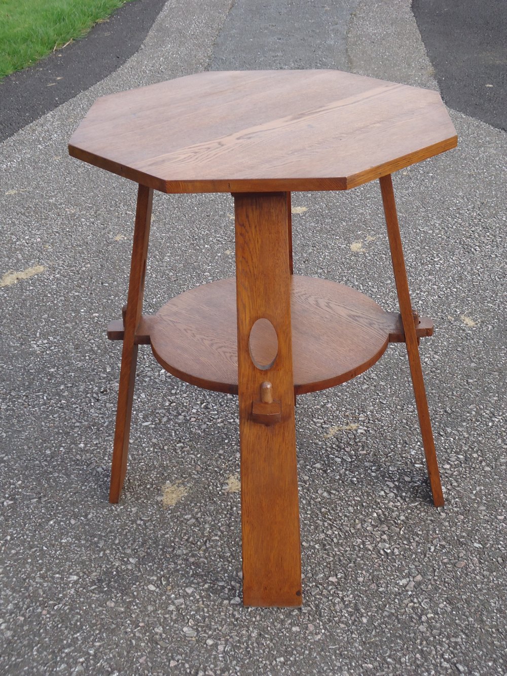 An unusual large Arts & Crafts oak two tiered pegged table with an octagonal top. Almost large enough for a dining table for two measuring 76cms high and the top measuring 46cms x 49cms.