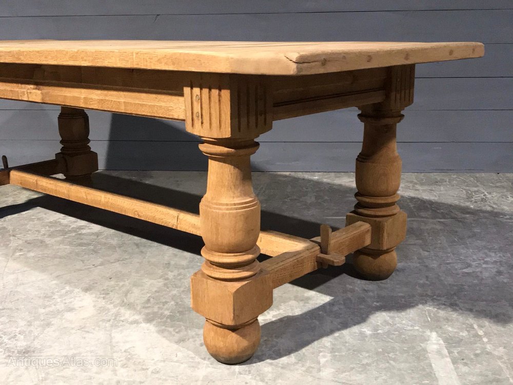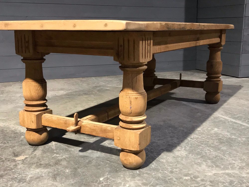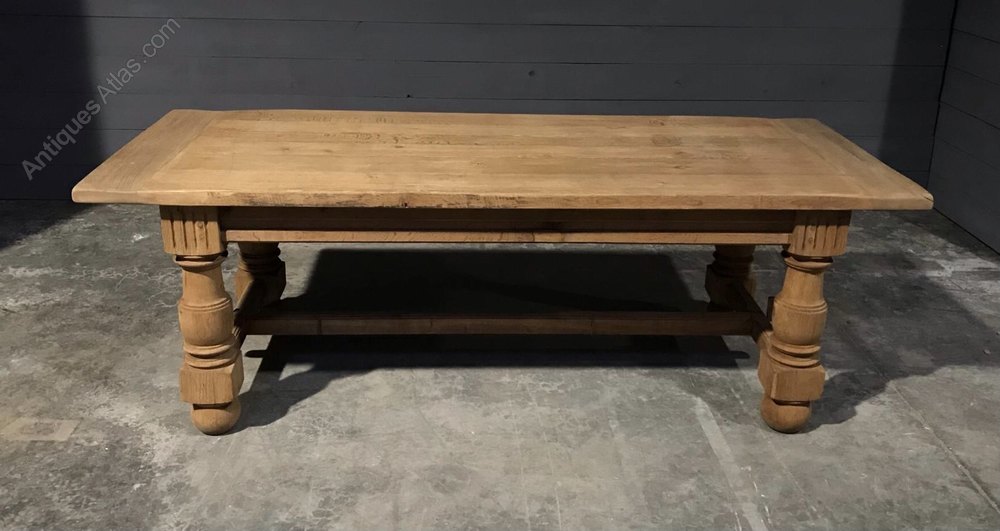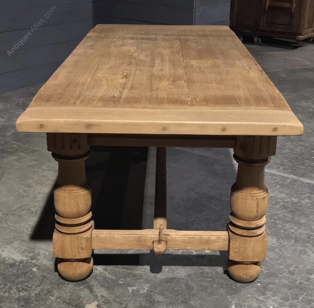 A large French Refectory Farmhouse Dining Table, made from solid Oak in the 1900’s. A very good quality table that will last for generations to come. We have bleached it for a lighter look but could be waxed or coloured to any colour/shade desired. Leg clearance is fine at 60.5 cm.