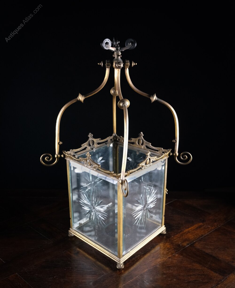 The swept arms terminate in fine spirals above a brass lantern frame with an intricate art-nouveau design to the top edge. The thick bevelled glass panels each boast finely cut stars which glisten when illuminated. The panel door is opened with a classical 'scroll in hand' finial