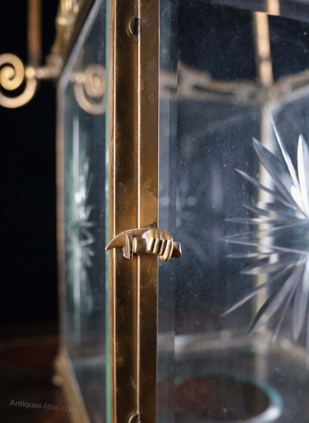 The swept arms terminate in fine spirals above a brass lantern frame with an intricate art-nouveau design to the top edge. The thick bevelled glass panels each boast finely cut stars which glisten when illuminated. The panel door is opened with a classical 'scroll in hand' finial