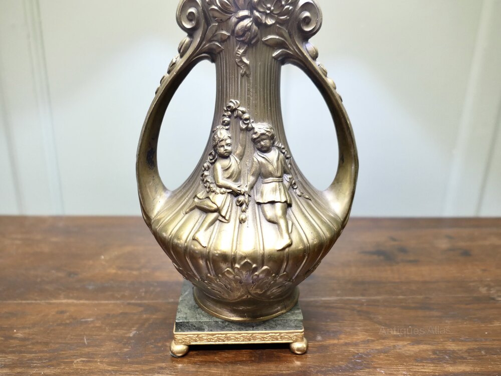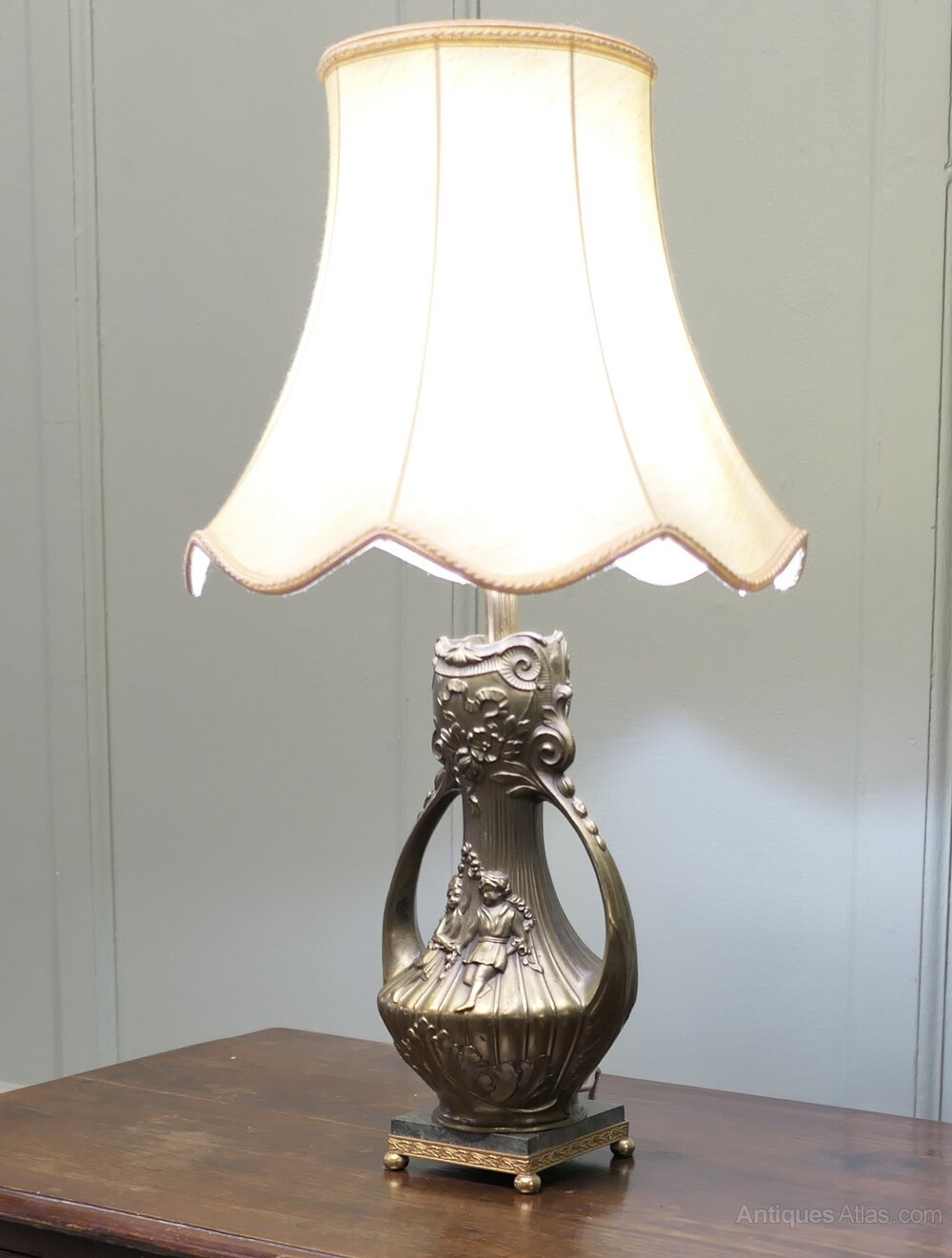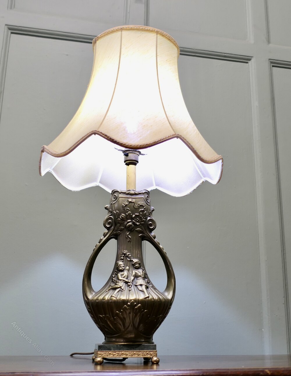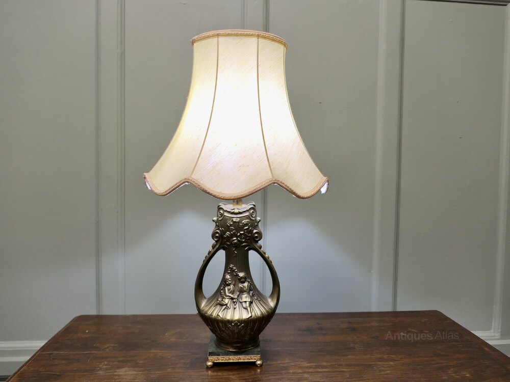 This is a very attractive and large lamp the two handled base is made in brass, it is decorated with dancing children