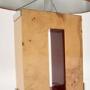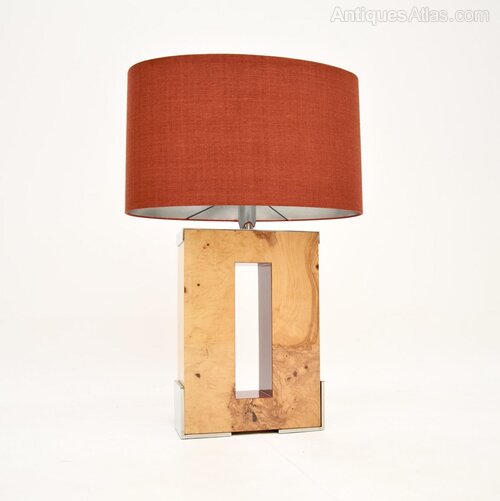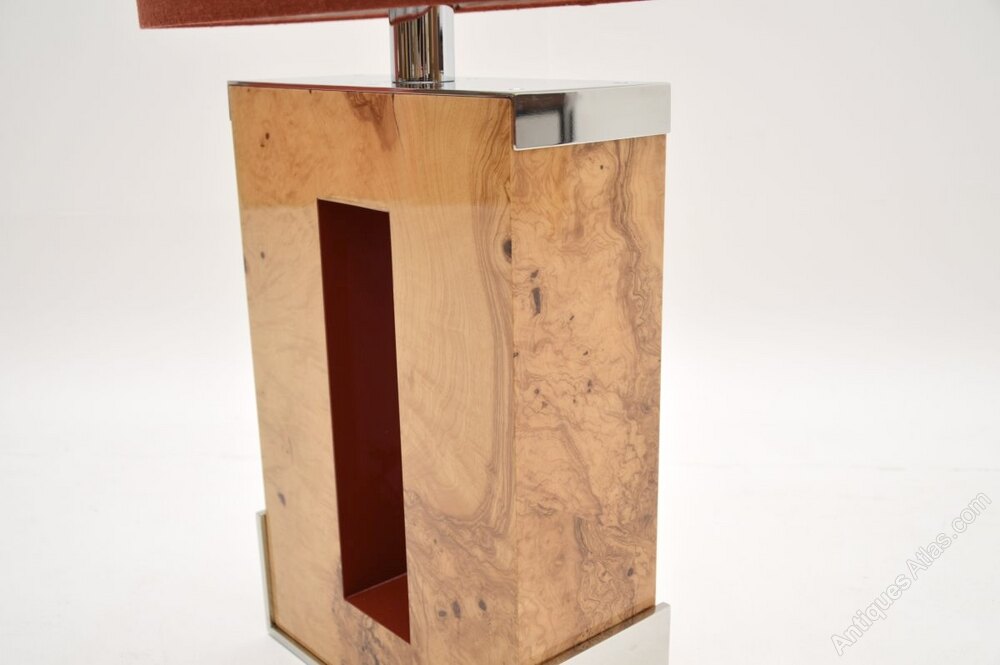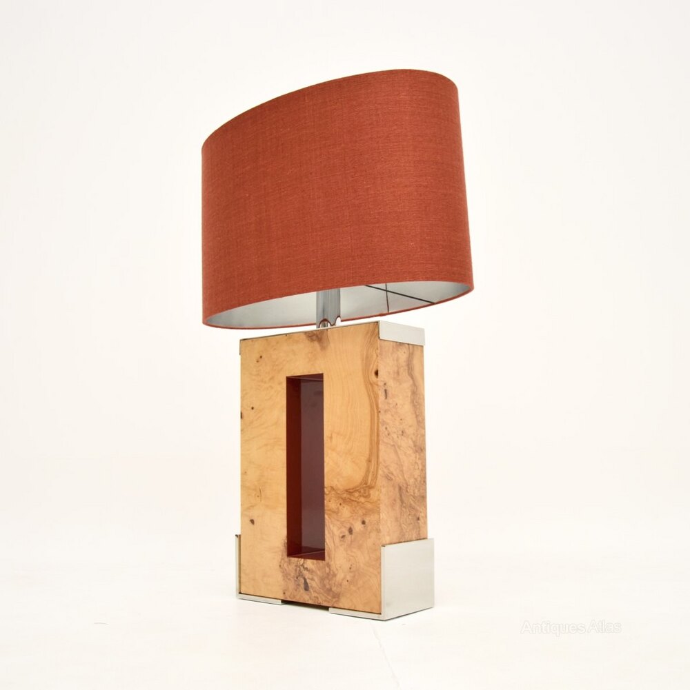 The burr walnut has a laqcuered finish and is mounted in thick chromed steel plates. This comes with the original red oval shade.