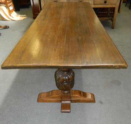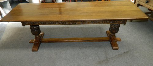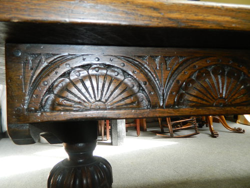 super large oak refectory table with carved frieze and wonderful substantial carved baluster supports.