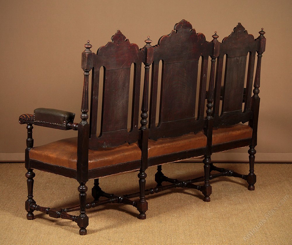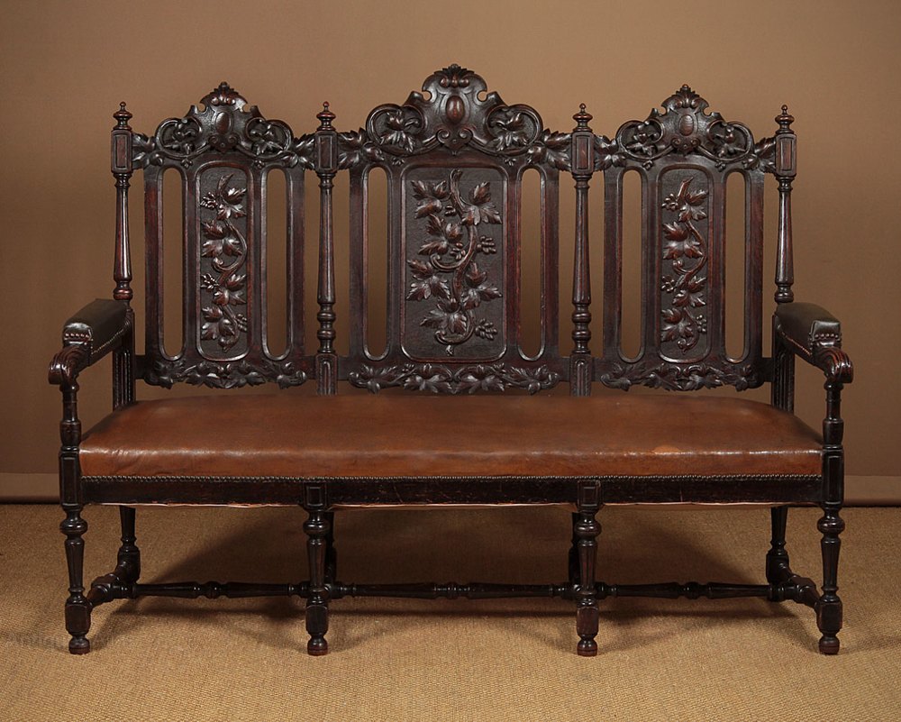 Large late 19th.c. oak chair back settle c.1880. Elaborate three panel backrest extensively carved with vine and grape detail between turned and reeded columns with turned finial tops. Padded arms with lovely scrolling acanthus leaf terminals. Over a deep sprung seat raised on eight turned and reeded legs joined with turned and block stretchers. Serviceable vintage faux leather upholstery. Very good condition, cleaned and waxed in our workshops.