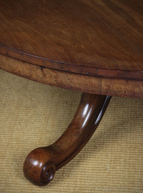 Early 19th.c. mahogany centre table c.1830 reduced in height to make a splendid feature coffee table. 54” diameter circular top with figured mahogany veneers on solid mahogany groundwork. Crossbanded edge and apron and raised on a turned column and tripod base with three solid shaped mahogany legs with carved scroll detail. Some old wear to the top, otherwise excellent condition and a lovely mellow colour. Cleaned and waxed in our workshops.