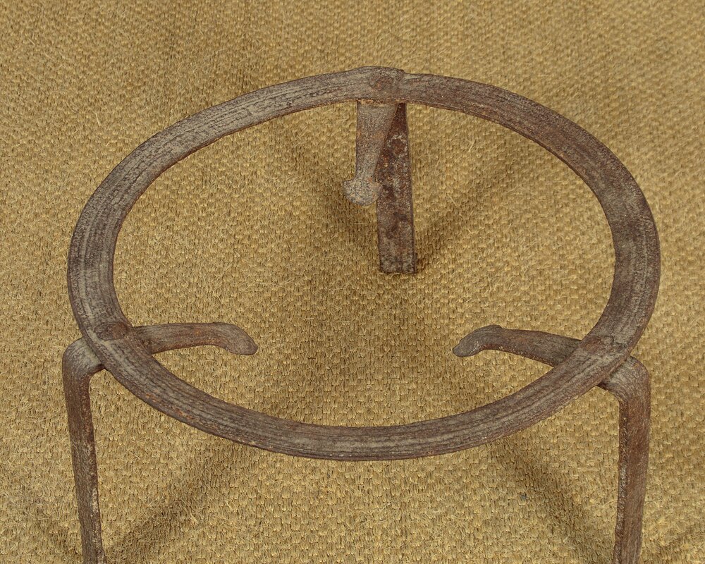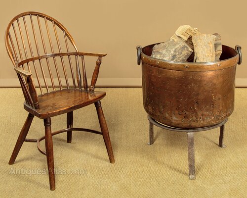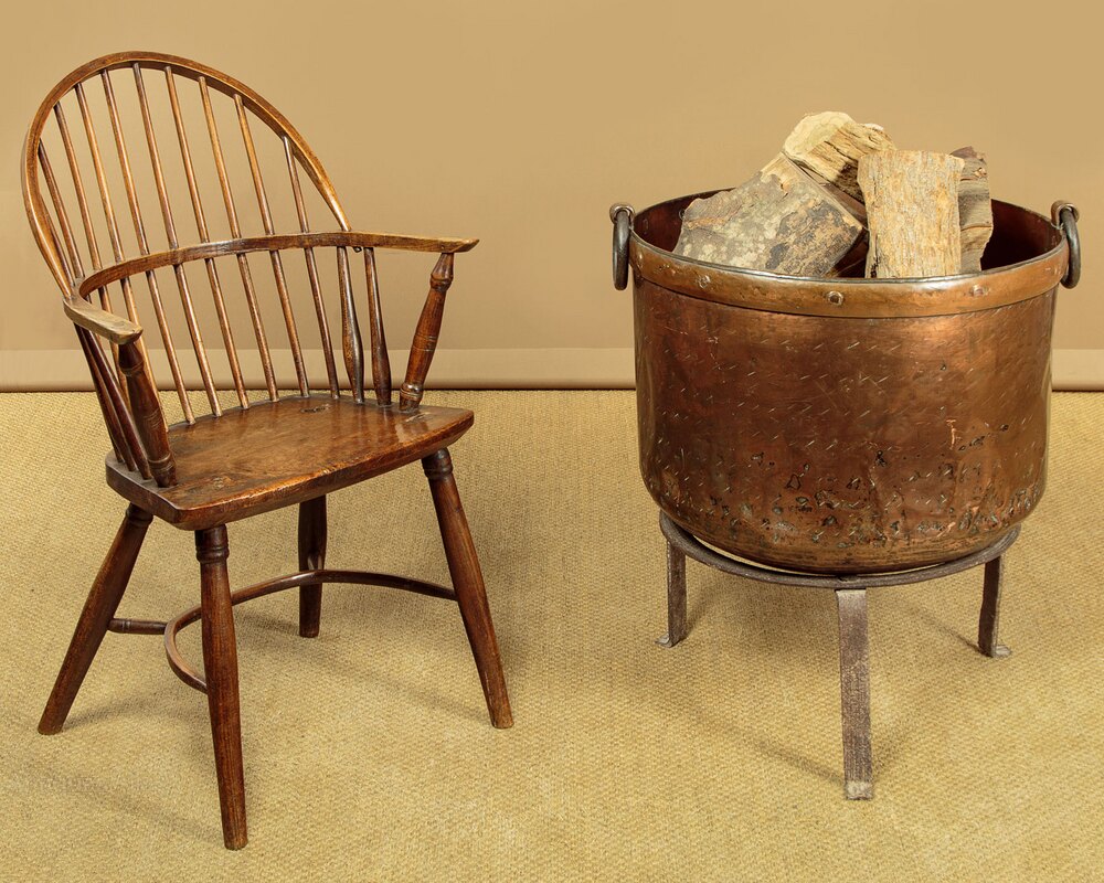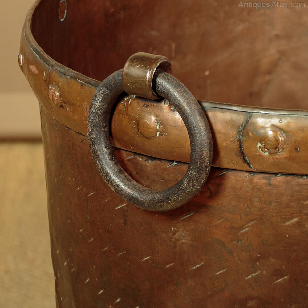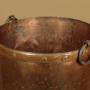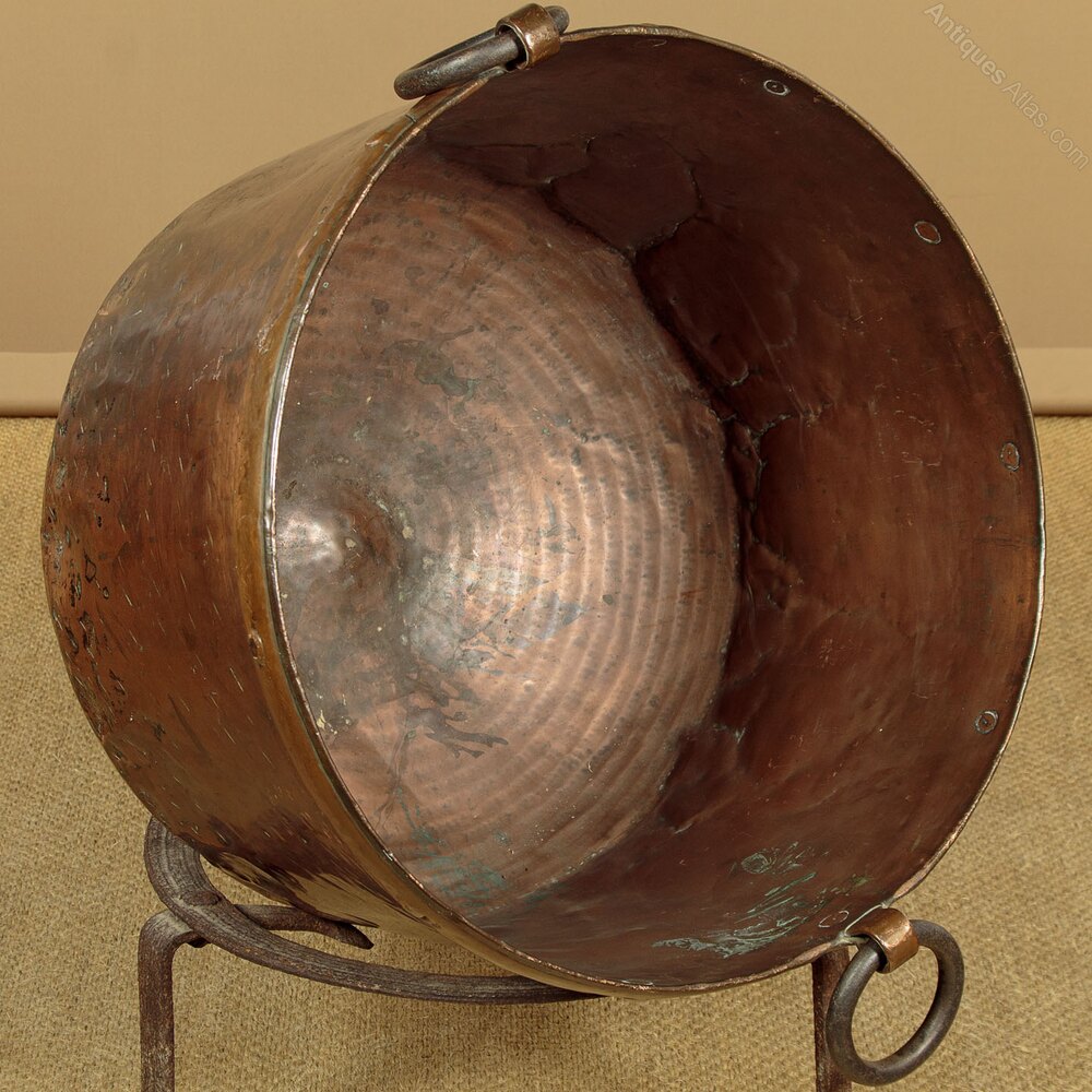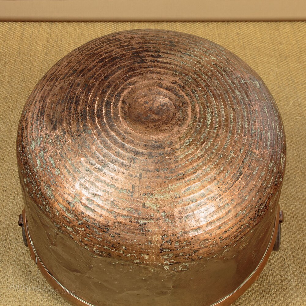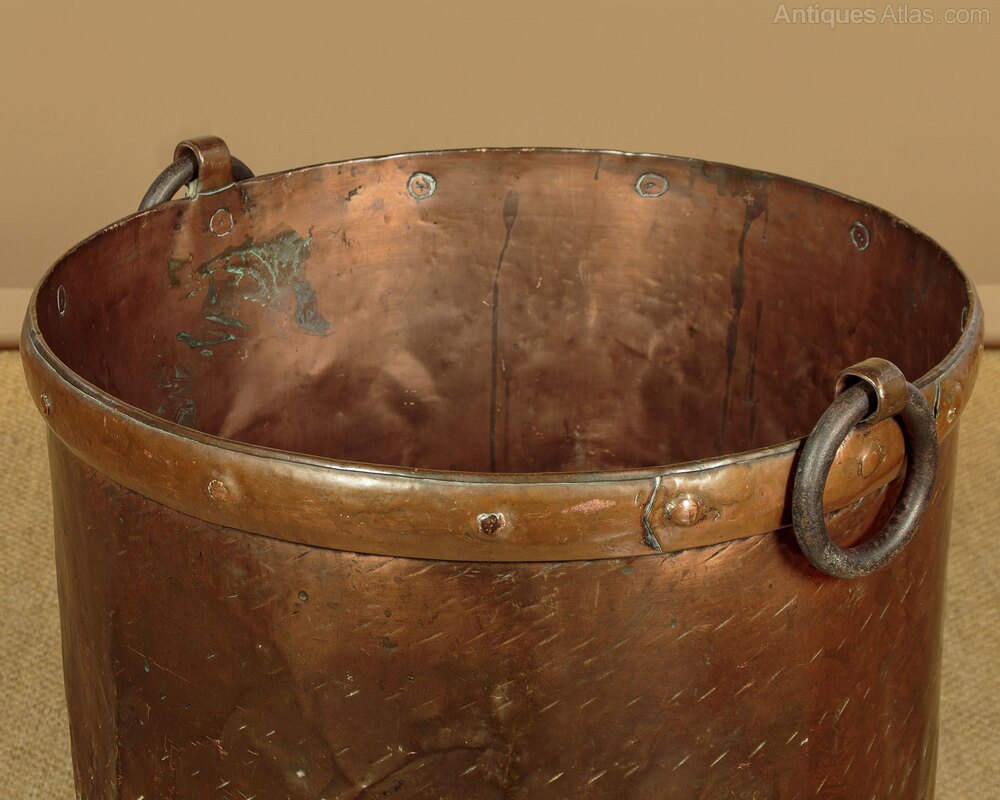 Very impressively proportioned late 19th.c copper pail on stand c.1890. Ideal as a log bin or as an outer pot for a large indoor plant perhaps. 24" diameter pail with an internal depth of 19" (volume is approx 130 litres!). Made, unusually, from a single piece of copper (rather than with riveted joints at the sides and base), with a riveted copper collar for strength and splendid large iron hoop handles. Note the pattern of hammer marks to the dome-shaped base and the decorative marks to the sides. Raised on a very sturdy wrought iron tripod base. Some wear and creases to the lower portion of the sides. Otherwise very good original condition. Presented as found.