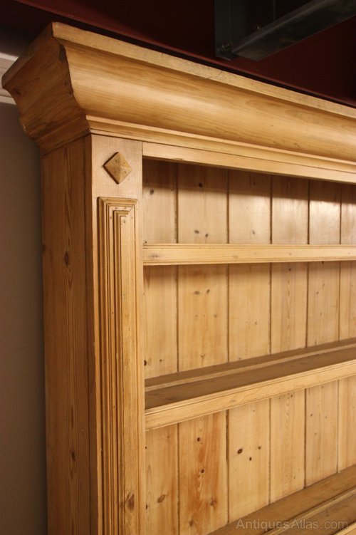 The dresser rack has a large, out turned cornice and the shelves have moulded fronts with elongated raised panel decorations to the sides.