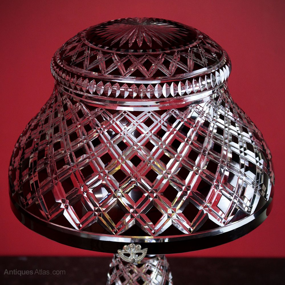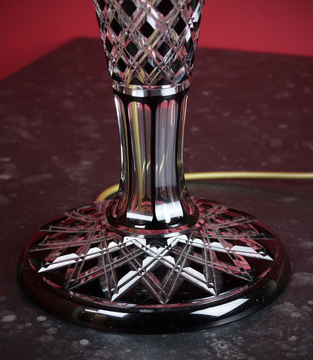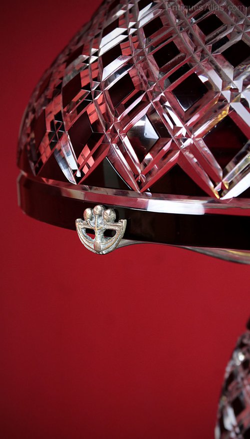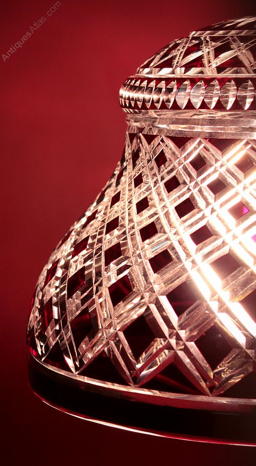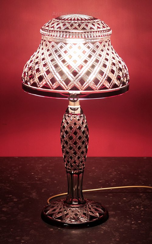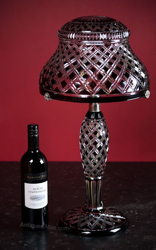Rare and highly decorative cut glass table lamp c.1920. Standing 22″ tall with a bell shaped shade on base both with cut hobnail decoration and single overlay in rich ruby colour. Presented in outstanding condition with original chromed shade supports. Cleaned, rewired, and sold with PAT test certificate.