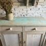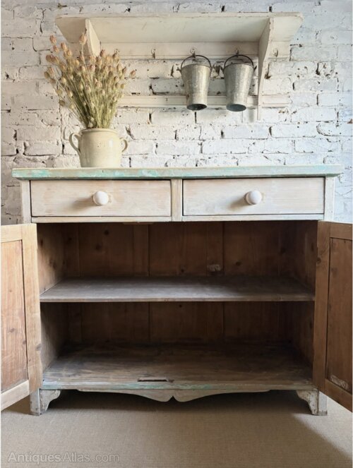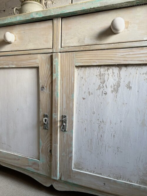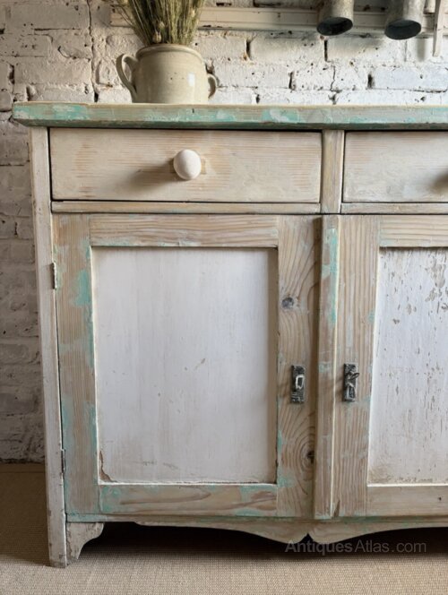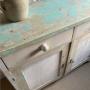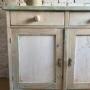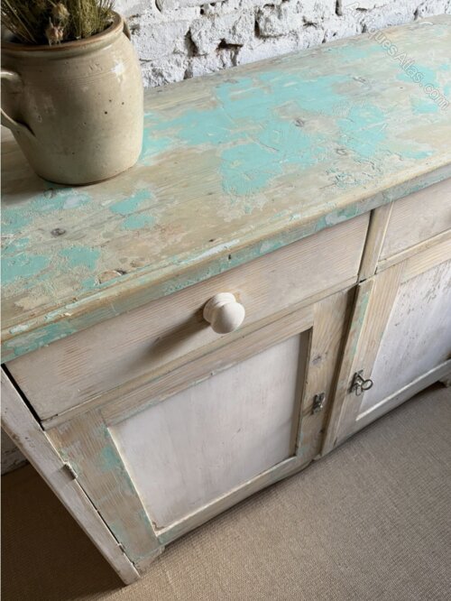A large scale pine cupboard with layered distressed paint. Generous proportions inside the cupboard with a sturdy midway shelf, supported by two deep drawers allowing ample space for storage. Neutral off white tones highlighted with aqua green. Expected wear & tear for its age but overall it’s a good solid piece. This one also comes with a working key.