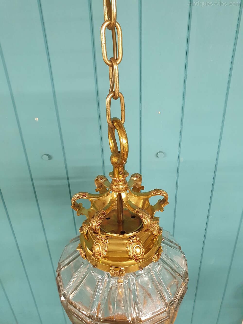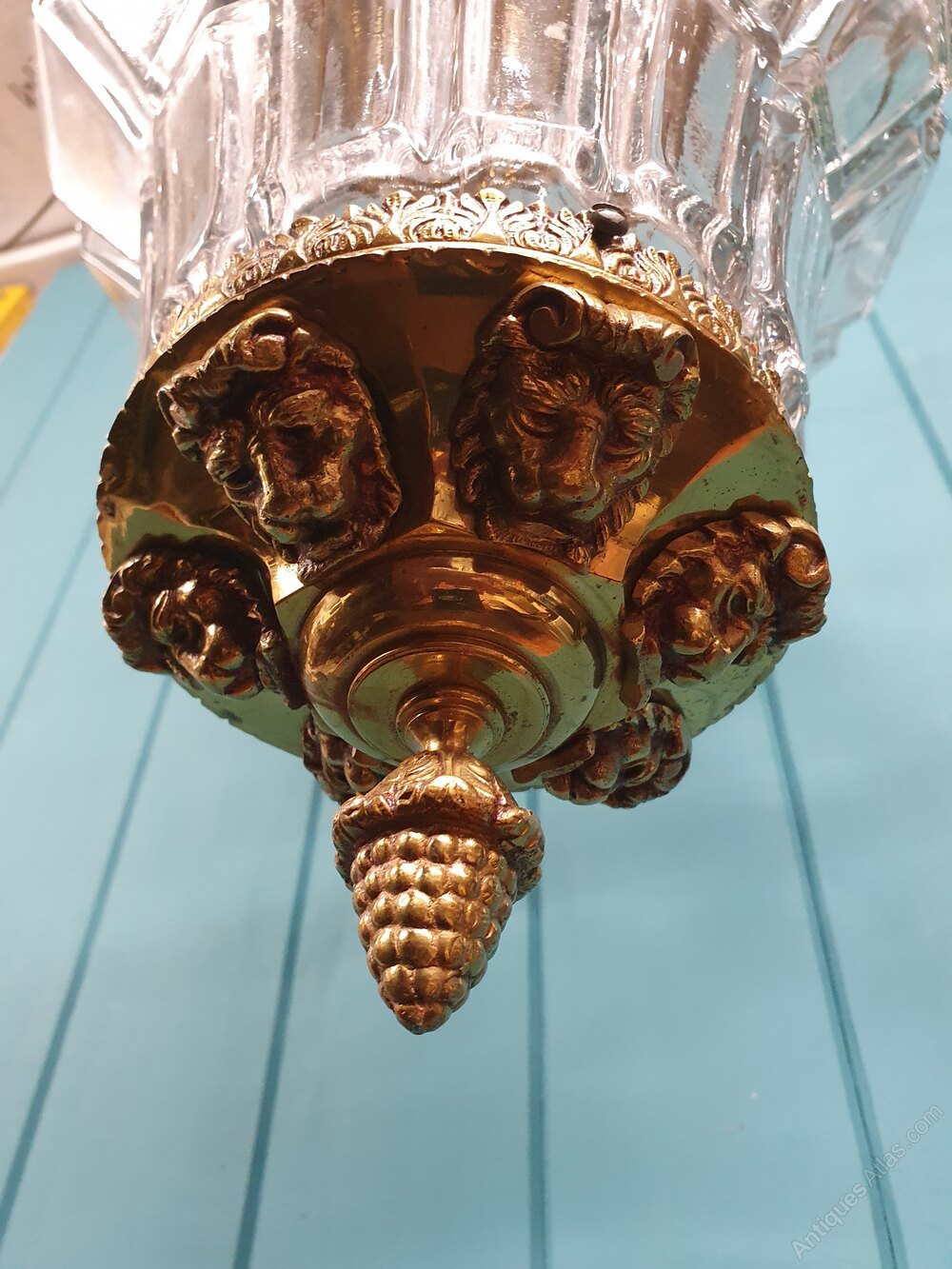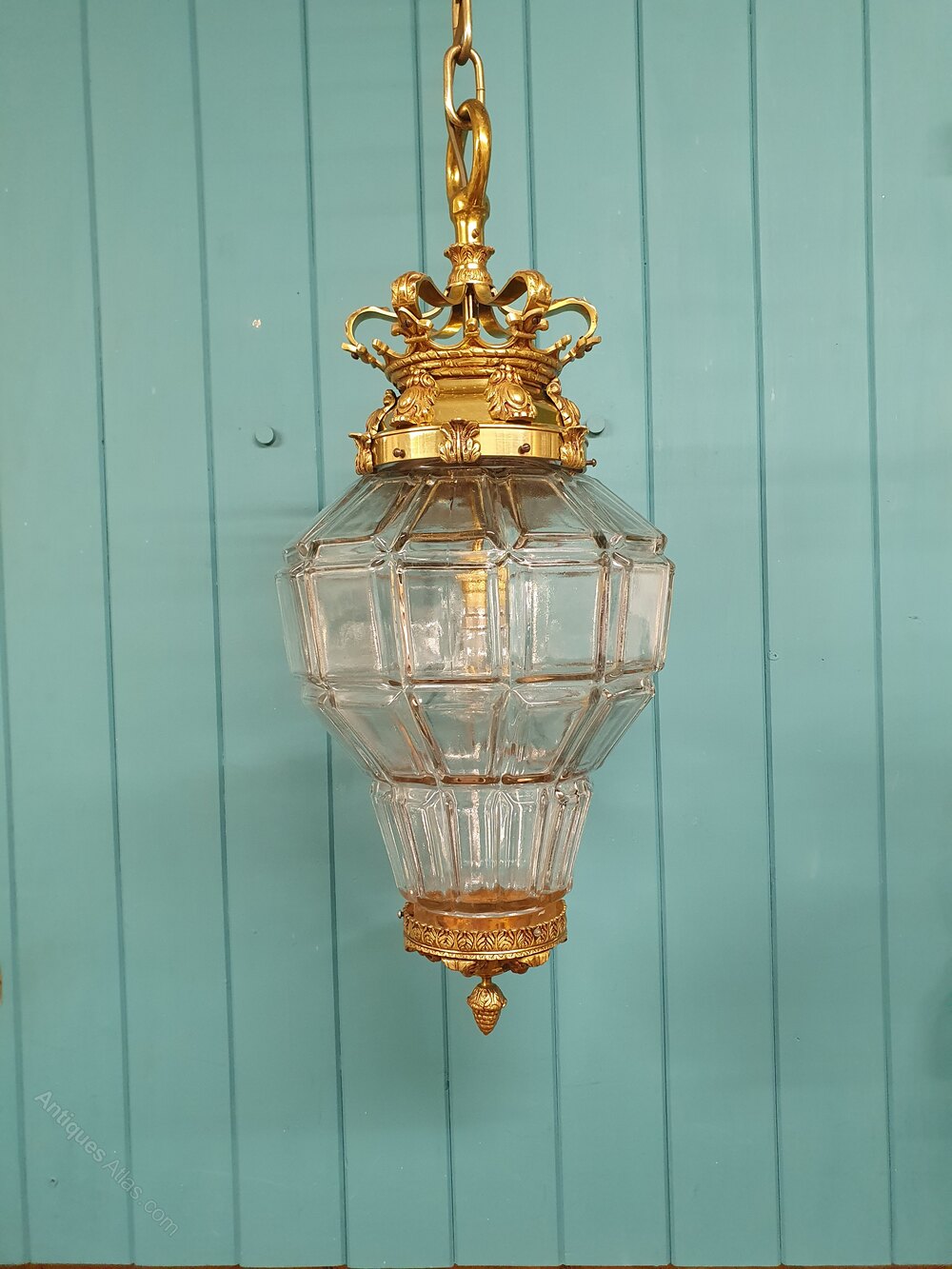 Hall lantern in brass and glass. This hanging lantern has an ornate coronet top with 20 cm of chain and comes with a ceiling rose measuring 14 cm wide. The glass section is 12-sided (dodecagon), commonly found on Georgian and Victorian hall lanterns. The cap on the bottom is decorated with line masks and finished with an acorn. This antique brass lantern comes with a large bayonet bulb holder B22. Entrance lantern, porch lantern, or ceiling lantern. This piece weighs 11 kg