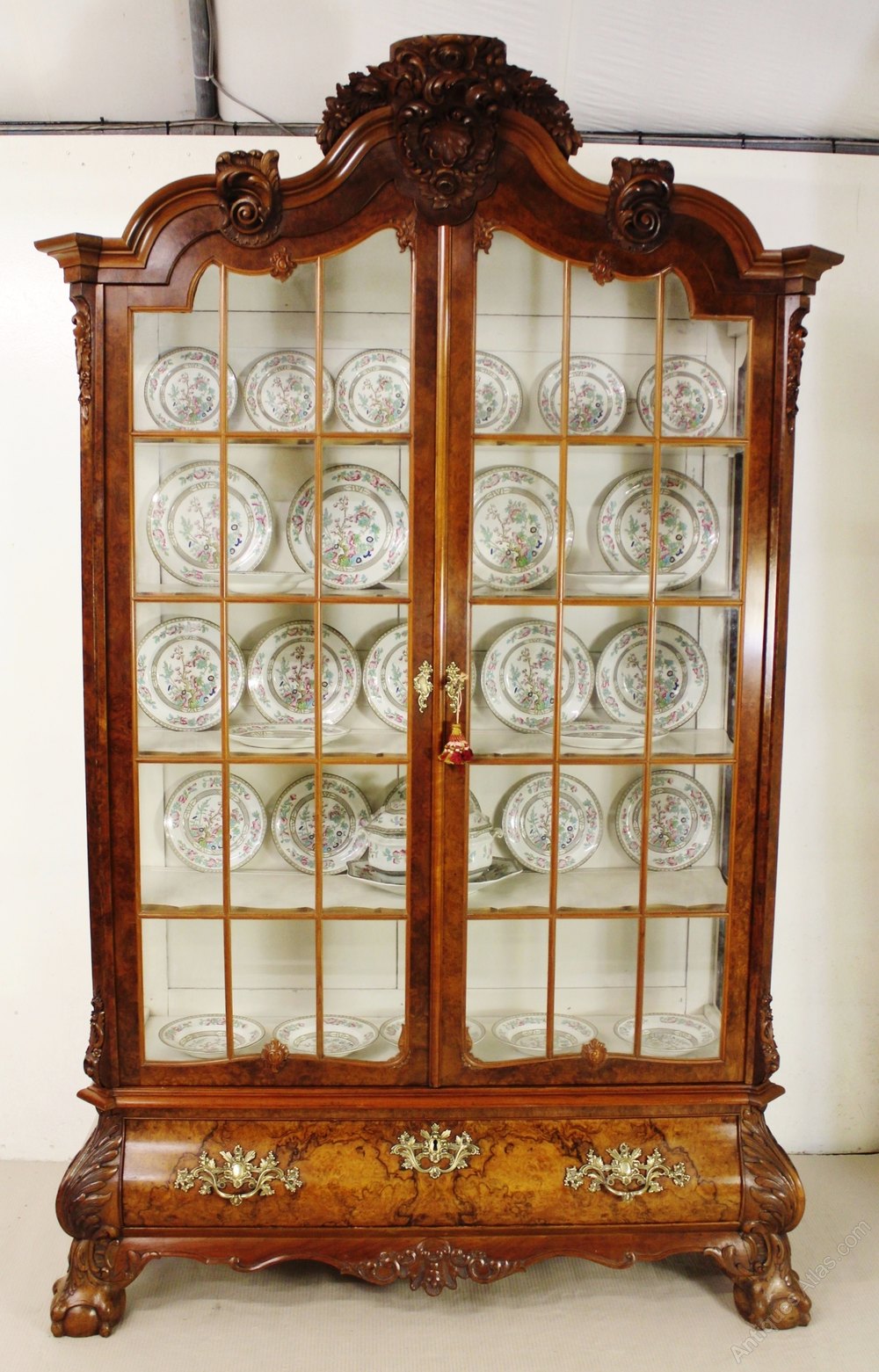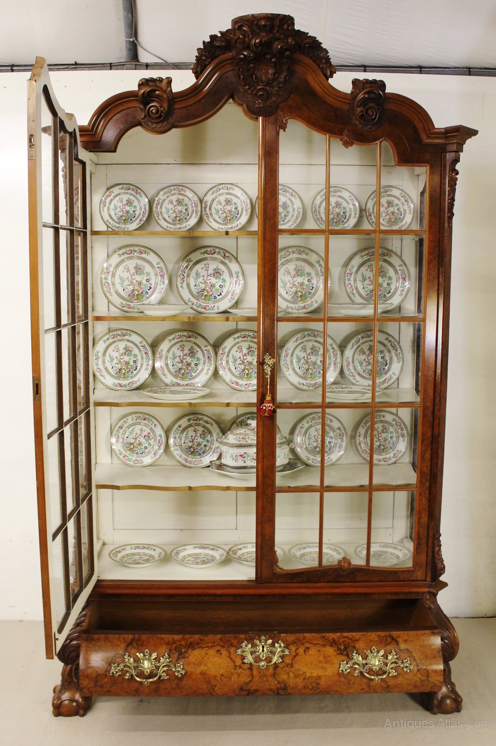 An impressive, large sized Dutch burr walnut cabinet or vitrine. Very well constructed in solid walnut with attractive burr walnut veneers onto an oak carcas. The two glazed doors (lockable with key supplied) open to access a painted interior with 5 shelves affording generous display space. The bombe shaped base has a single long drawer (lockable with key supplied) which is fitted with its original crisply cast bold brass hardware. All standing on imposing carved ball and claw feet. The domed arch top is further decorated with crisply carved detailing including a splendid central pediment. Cleaned and waxed in our workshops and now offered for sale in excellent condition. with a great colour and patina, ready to go straight into the home. Splits down into sections for ease of installation.